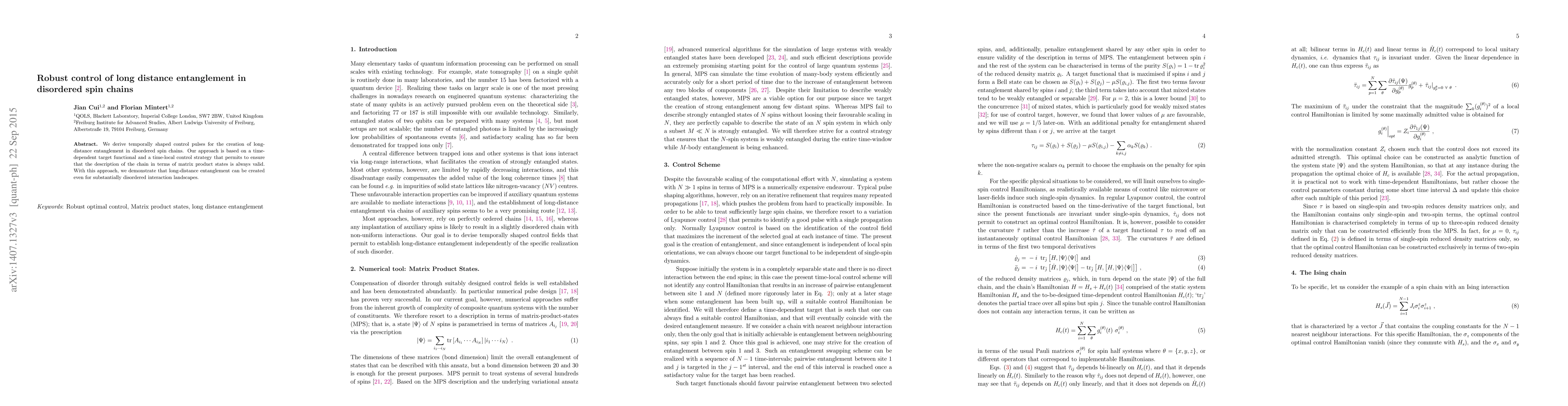 This paper develops temporally shaped control pulses to create long-distance entanglement in disordered spin chains using a time-dependent target functional and time-local control strategy, ensuring matrix product state validity even in highly disordered systems. The method successfully generates long-distance entanglement despite significant disorder.