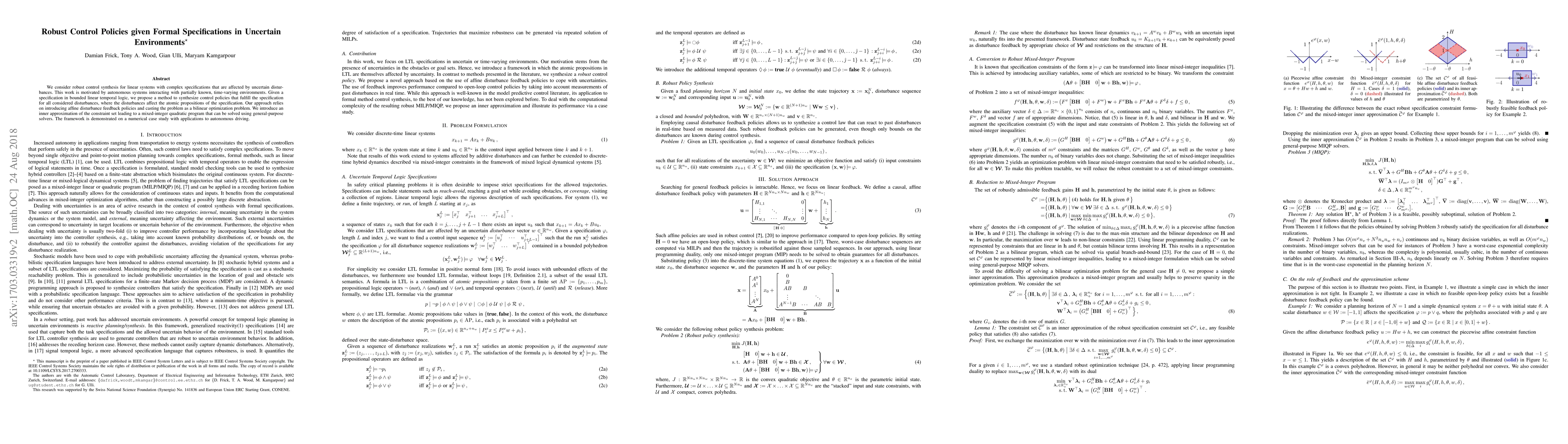 This paper proposes a method for robust control synthesis in linear systems with uncertain disturbances, ensuring specifications in bounded linear temporal logic are met. It utilizes affine disturbance feedback and formulates the problem as a mixed-integer quadratic program, demonstrated through a case study in autonomous driving.