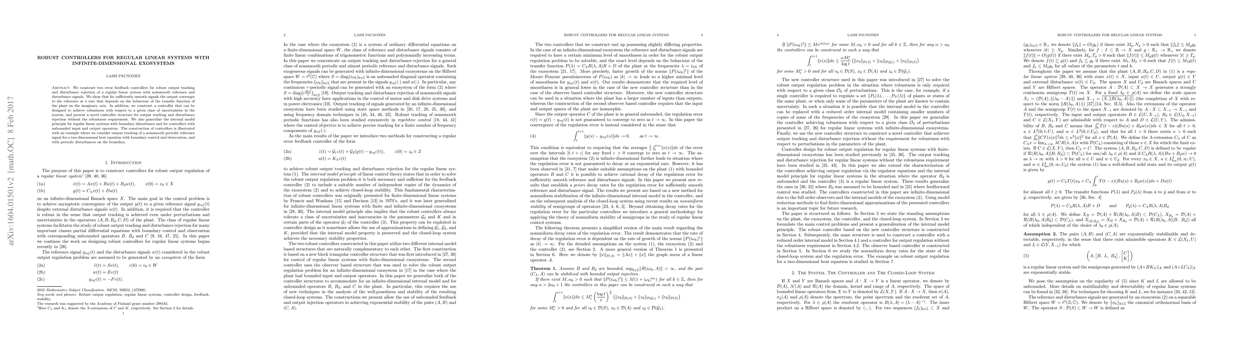 This paper constructs two error feedback controllers for robust output tracking and disturbance rejection in regular linear systems with infinite-dimensional exosystems. It demonstrates convergence rates for smooth signals and presents a novel controller structure for non-robust tracking, along with an example involving a two-dimensional heat equation.