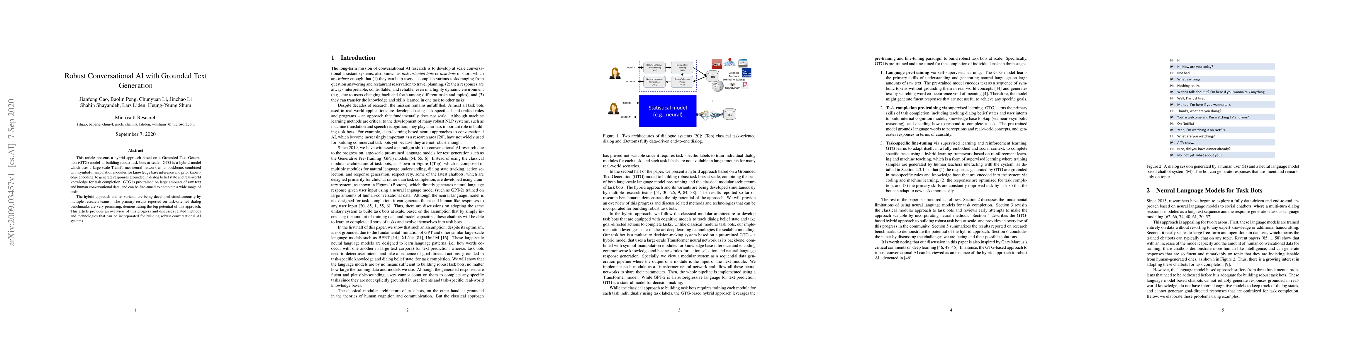 This article presents a hybrid approach based on a Grounded Text Generation (GTG) model to building robust task bots at scale. GTG is a hybrid model which uses a large-scale Transformer neural network as its backbone, combined with symbol-manipulation modules for knowledge base inference and prior knowledge encoding, to generate responses grounded in dialog belief state and real-world knowledge for task completion. GTG is pre-trained on large amounts of raw text and human conversational data, and can be fine-tuned to complete a wide range of tasks. The hybrid approach and its variants are being developed simultaneously by multiple research teams. The primary results reported on task-oriented dialog benchmarks are very promising, demonstrating the big potential of this approach. This article provides an overview of this progress and discusses related methods and technologies that can be incorporated for building robust conversational AI systems.