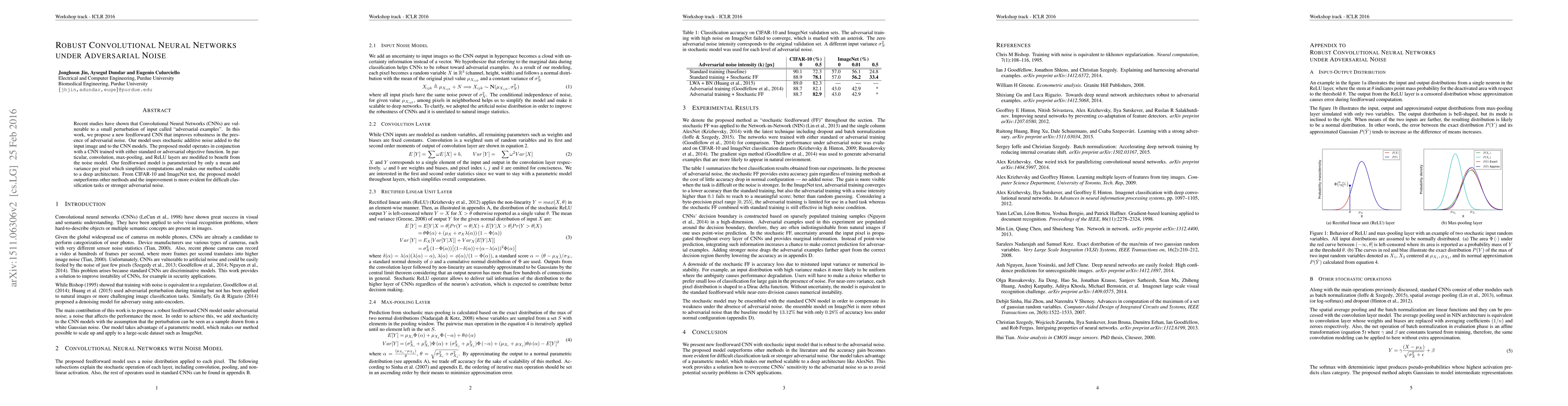 This paper proposes a robust feedforward CNN that enhances resilience against adversarial noise by incorporating stochastic additive noise into both input images and the network layers. The model, which requires minimal parameterization, demonstrates superior performance on CIFAR-10 and ImageNet, especially under challenging conditions with stronger adversarial perturbations.
