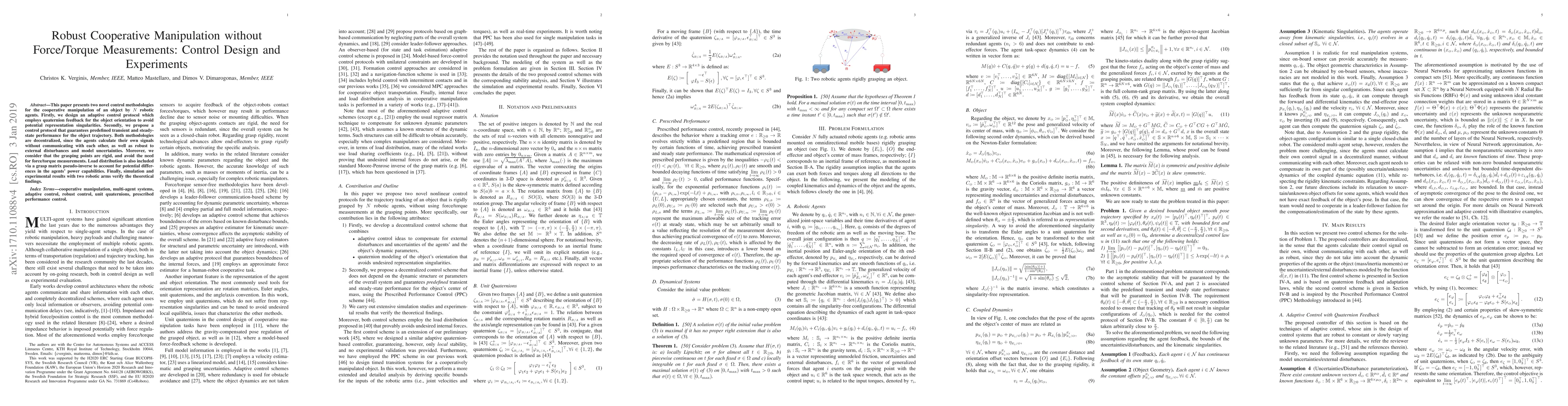 This paper introduces adaptive control protocols for cooperative manipulation by N robotic agents without force/torque measurements, employing quaternion feedback to avoid singularities and ensuring predefined performance. Both control methods are decentralized and robust to disturbances, verified through simulations and experiments with two robotic arms.