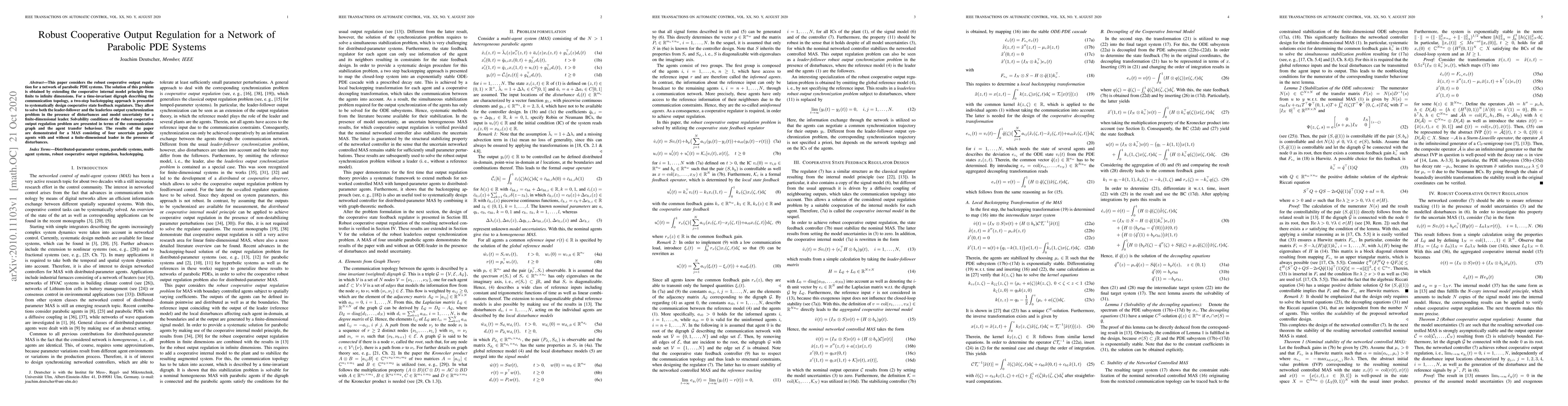 This paper considers the robust cooperative output regulation for a network of parabolic PDE systems. The solution of this problem is obtained by extending the cooperative internal model principle from finite to infinite dimensions. For a time-invariant digraph describing the communication topology, a two-step backstepping approach is presented to systematically design cooperative state feedback regulators. They allow to solve both the leader-follower and the leaderless output synchronization problem in the presence of disturbances and model uncertainty for a finite-dimensional leader. Solvability conditions of the robust cooperative output regulation problem are presented in terms of the communication graph and the agent transfer behaviour. The results of the paper are demonstrated for a MAS consisting of four uncertain parabolic agents with and without a finite-dimensional leader in the presence of disturbances.