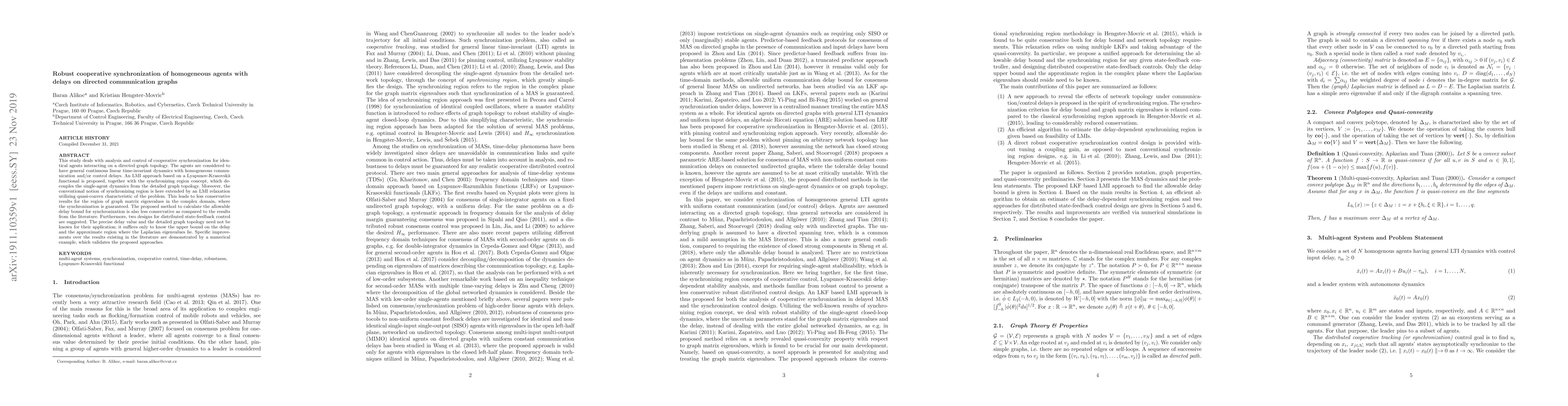 This study deals with analysis and control of cooperative synchronization for identical agents interacting on a directed graph topology. The agents are considered to have general continuous linear time-invariant dynamics with homogeneous communication and/or control delays. An LMI approach based on a Lyapunov-Krasovskii functional is proposed, together with the synchronizing region concept, which decouples the single-agent dynamics from the detailed graph topology. Moreover, the conventional notion of synchronizing region is here extended by an LMI relaxation utilizing quasi-convex characteristic of the problem. This leads to less conservative results for the region of graph matrix eigenvalues in the complex domain, where the synchronization is guaranteed. The proposed method to calculate the allowable delay bound for synchronization is also less conservative as compared to the results from the literature. Furthermore, two designs for distributed state-feedback control are suggested. The precise delay value and the detailed graph topology need not be known for their application; it suffices only to know the upper bound on the delay and the approximate region where the Laplacian eigenvalues lie. Specific improvements over the results existing in the literature are demonstrated by a numerical example, which validates the proposed approaches.