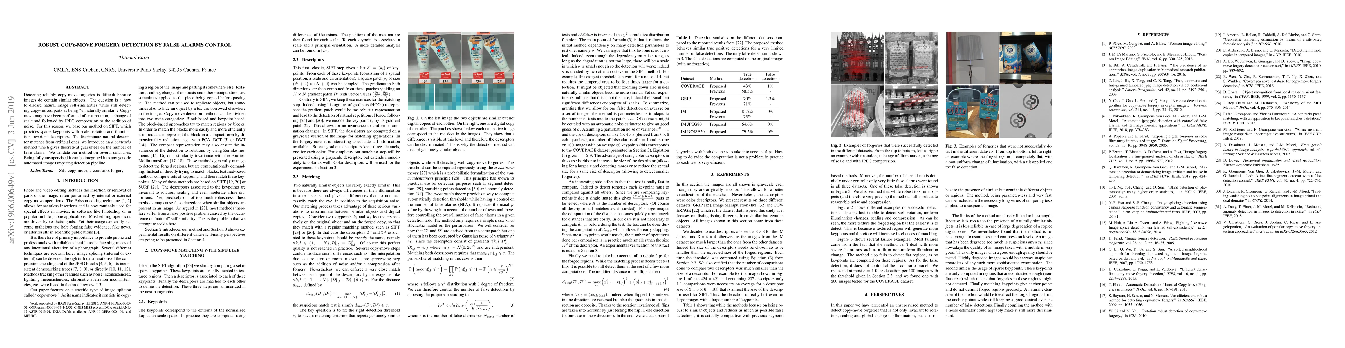 This research introduces a robust method for detecting copy-move forgeries in images using SIFT descriptors. It controls false alarms with an a contrario approach, offering theoretical guarantees and unsupervised functionality, making it suitable for automated tampering detection pipelines.