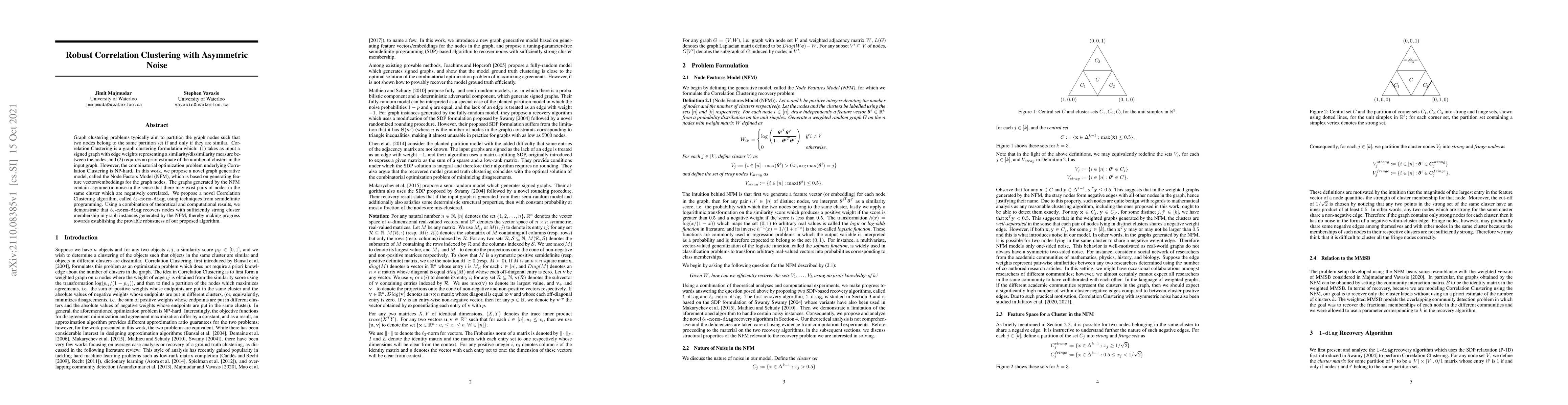 Graph clustering problems typically aim to partition the graph nodes such that two nodes belong to the same partition set if and only if they are similar. Correlation Clustering is a graph clustering formulation which: (1) takes as input a signed graph with edge weights representing a similarity/dissimilarity measure between the nodes, and (2) requires no prior estimate of the number of clusters in the input graph. However, the combinatorial optimization problem underlying Correlation Clustering is NP-hard. In this work, we propose a novel graph generative model, called the Node Factors Model (NFM), which is based on generating feature vectors/embeddings for the graph nodes. The graphs generated by the NFM contain asymmetric noise in the sense that there may exist pairs of nodes in the same cluster which are negatively correlated. We propose a novel Correlation Clustering algorithm, called \anormd, using techniques from semidefinite programming. Using a combination of theoretical and computational results, we demonstrate that $\texttt{$\ell_2$-norm-diag}$ recovers nodes with sufficiently strong cluster membership in graph instances generated by the NFM, thereby making progress towards establishing the provable robustness of our proposed algorithm.