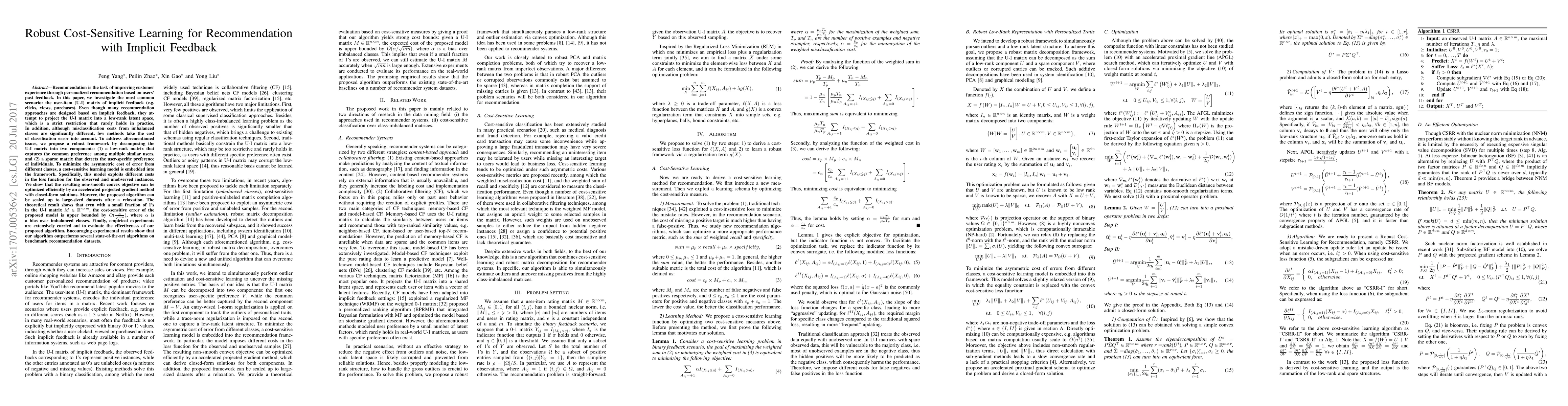 This paper proposes a robust cost-sensitive learning framework for recommendation systems using implicit feedback, addressing the limitations of existing low-rank matrix projection methods. The framework decomposes the user-item matrix into common and user-specific preferences, incorporating a cost-sensitive model to handle class imbalance, and demonstrates efficient optimization and scalability.