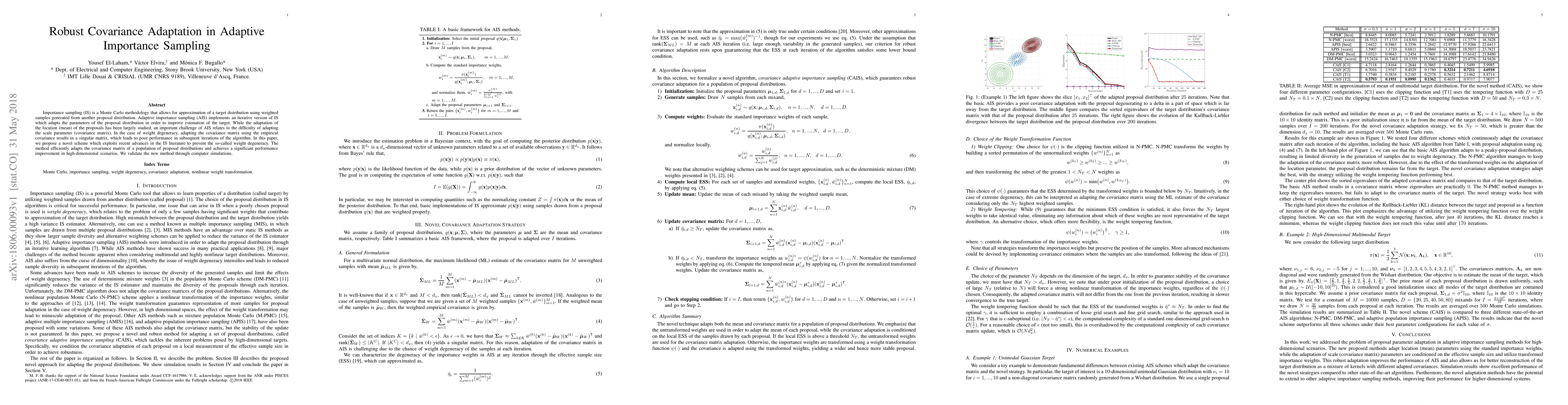 This paper proposes a novel scheme to adapt the covariance matrix in adaptive importance sampling, addressing weight degeneracy and improving performance in high-dimensional scenarios. The method achieves significant improvements validated through computer simulations.