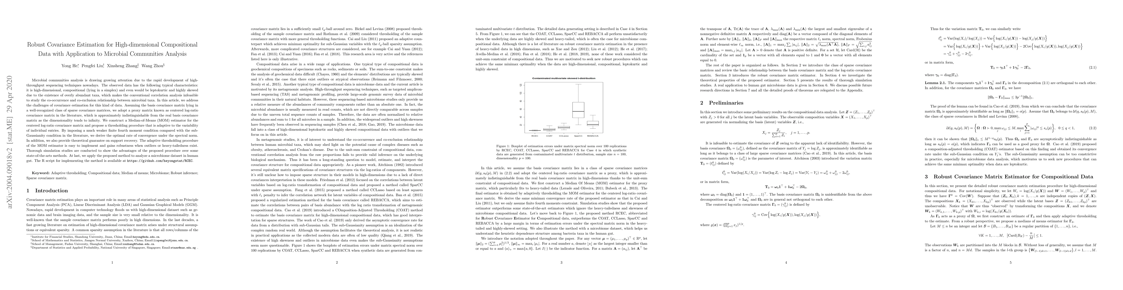 This paper proposes a robust covariance estimation method for high-dimensional compositional data, specifically addressing microbial communities analysis. It introduces a Median-of-Means estimator for the centered log-ratio covariance matrix, along with an adaptive thresholding procedure, achieving optimal convergence rates under weaker conditions than previous methods. The approach is validated through simulations and applied to a human gut microbiome dataset.