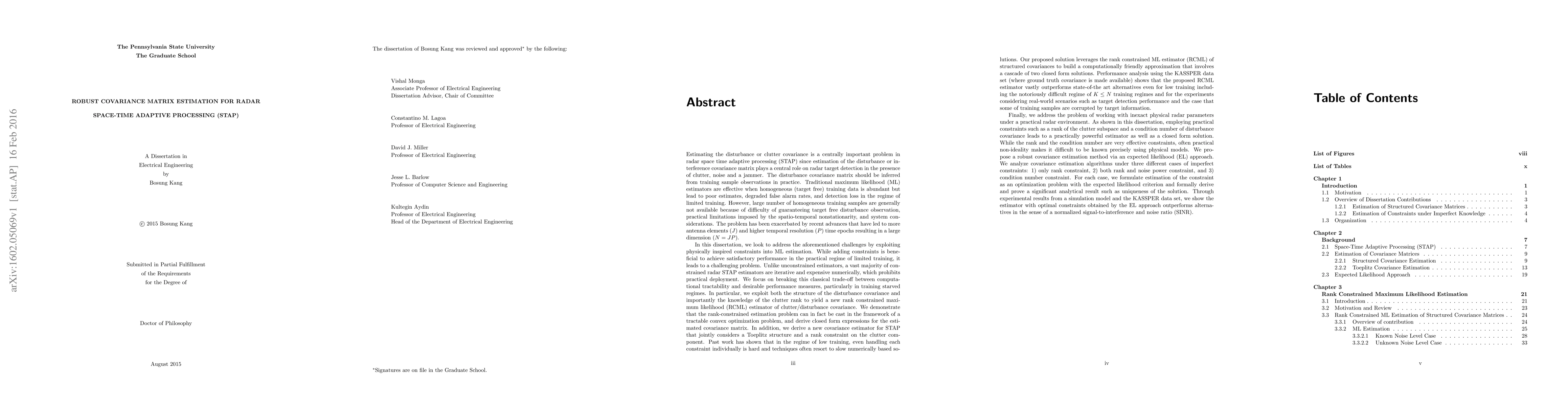 Estimating the disturbance or clutter covariance is a centrally important problem in radar space time adaptive processing (STAP). The disturbance covariance matrix should be inferred from training sample observations in practice. Large number of homogeneous training samples are generally not available because of difficulty of guaranteeing target free disturbance observation, practical limitations imposed by the spatio-temporal nonstationarity, and system considerations. In this dissertation, we look to address the aforementioned challenges by exploiting physically inspired constraints into ML estimation. While adding constraints is beneficial to achieve satisfactory performance in the practical regime of limited training, it leads to a challenging problem. We focus on breaking this classical trade-off between computational tractability and desirable performance measures, particularly in training starved regimes. In particular, we exploit both the structure of the disturbance covariance and importantly the knowledge of the clutter rank to yield a new rank constrained maximum likelihood (RCML) estimator. In addition, we derive a new covariance estimator for STAP that jointly considers a Toeplitz structure and a rank constraint on the clutter component. Finally, we address the problem of working with inexact physical radar parameters under a practical radar environment. We propose a robust covariance estimation method via an expected likelihood (EL) approach. We analyze covariance estimation algorithms under three different cases of imperfect constraints: 1) only rank constraint, 2) both rank and noise power constraint, and 3) condition number constraint. For each case, we formulate estimation of the constraint as an optimization problem with the EL criterion and formally derive and prove a significant analytical result such as uniqueness of the solution.