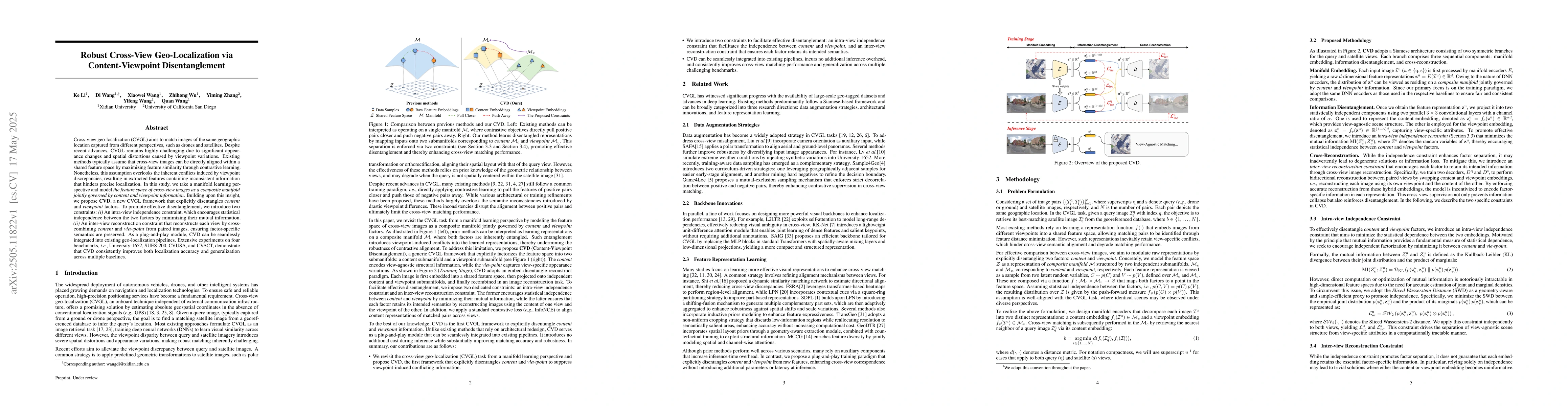 A new framework, CVD, uses manifold learning to disentangle content and viewpoint factors in cross-view geo-localization, improving localization accuracy and generalization.