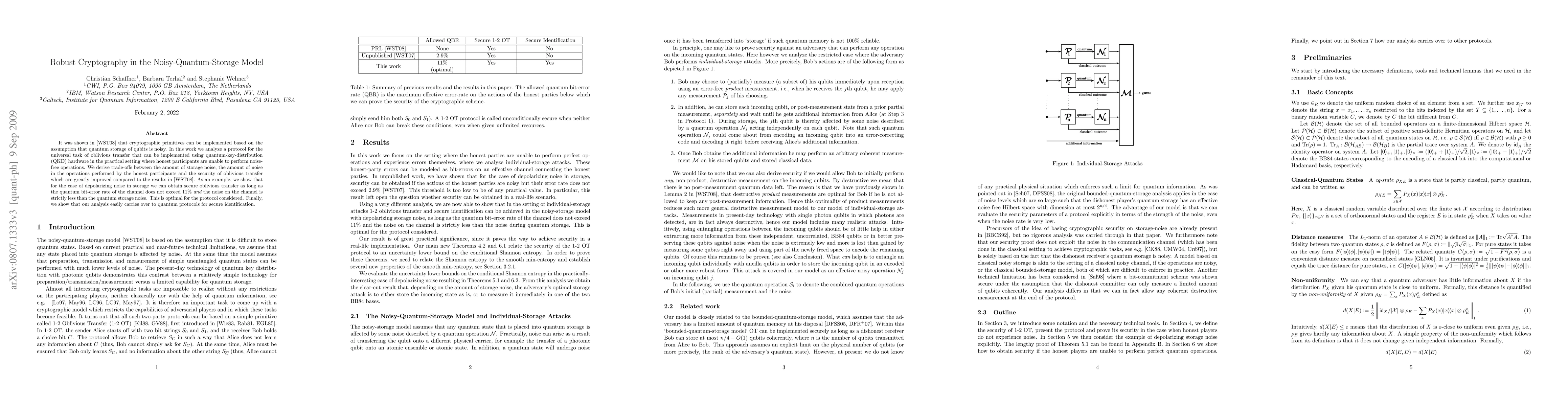 It was shown in [WST08] that cryptographic primitives can be implemented based on the assumption that quantum storage of qubits is noisy. In this work we analyze a protocol for the universal task of oblivious transfer that can be implemented using quantum-key-distribution (QKD) hardware in the practical setting where honest participants are unable to perform noise-free operations. We derive trade-offs between the amount of storage noise, the amount of noise in the operations performed by the honest participants and the security of oblivious transfer which are greatly improved compared to the results in [WST08]. As an example, we show that for the case of depolarizing noise in storage we can obtain secure oblivious transfer as long as the quantum bit-error rate of the channel does not exceed 11% and the noise on the channel is strictly less than the quantum storage noise. This is optimal for the protocol considered. Finally, we show that our analysis easily carries over to quantum protocols for secure identification.