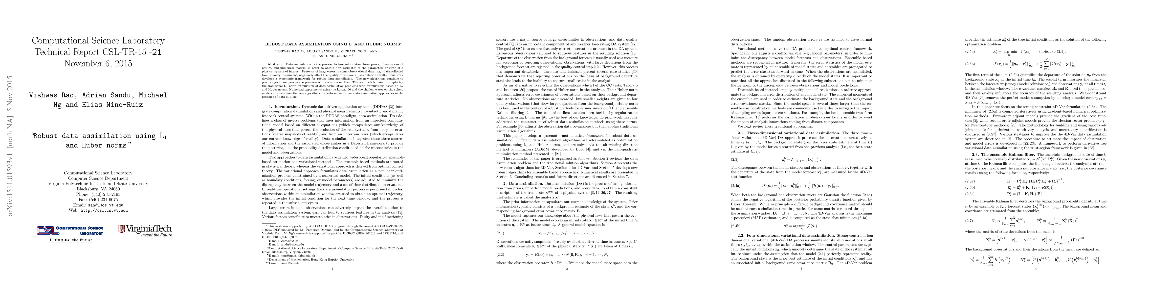 This paper proposes robust data assimilation algorithms based on $L_1$ and Huber norms to handle outliers in observational data, outperforming traditional $L_2$ norm methods as demonstrated through numerical experiments with Lorenz-96 and shallow water models.
