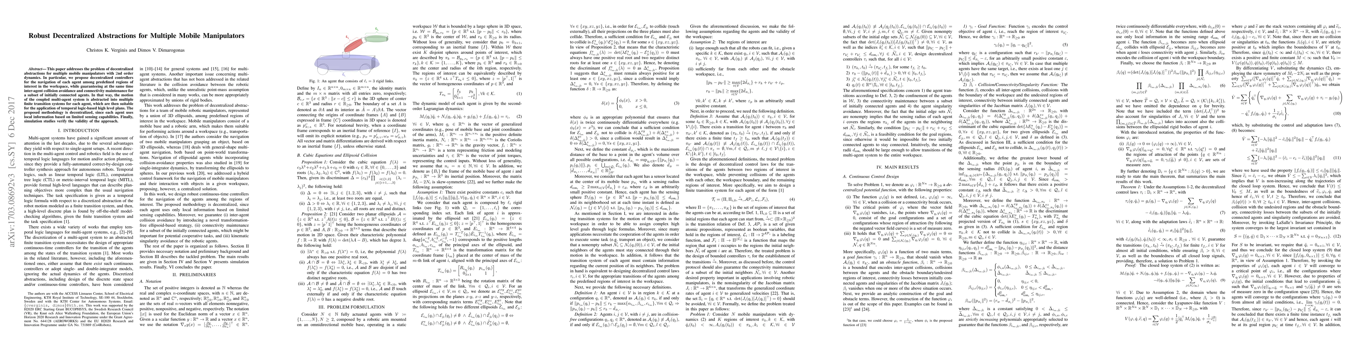 This paper addresses the problem of decentralized abstractions for multiple mobile manipulators with 2nd order dynamics. In particular, we propose decentralized controllers for the navigation of each agent among predefined regions of interest in the workspace, while guaranteeing at the same time inter-agent collision avoidance and connectivity maintenance for a subset of initially connected agents. In that way, the motion of the coupled multi-agent system is abstracted into multiple finite transition systems for each agent, which are then suitable for the application of temporal logic-based high level plans. The proposed methodology is decentralized, since each agent uses local information based on limited sensing capabilities. Finally, simulation studies verify the validity of the approach.
