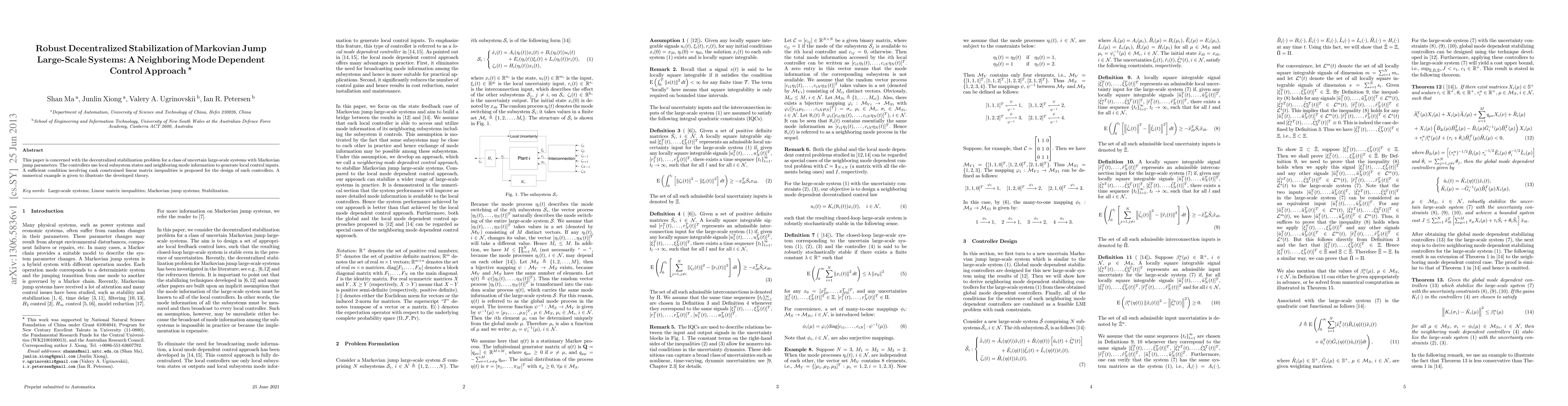 This paper addresses decentralized stabilization for large-scale systems with Markovian jump parameters, employing neighboring mode dependent control based on local subsystem states. A rank-constrained linear matrix inequality approach is proposed for controller design, validated through a numerical example.