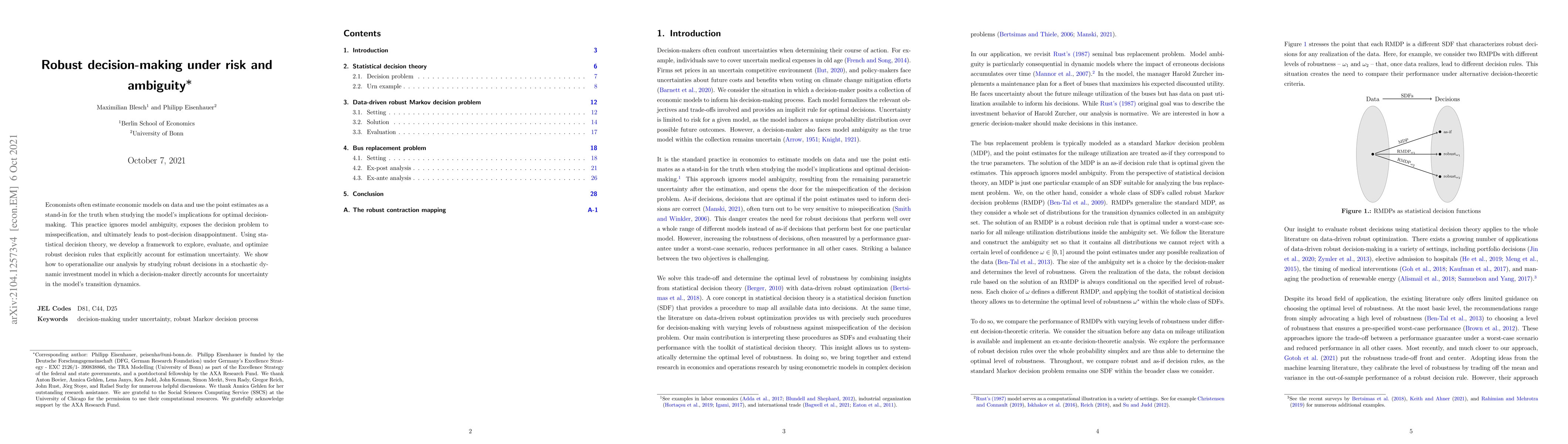 Researchers develop a framework for robust decision-making under risk and ambiguity, accounting for estimation uncertainty in economic models. This approach aims to avoid post-decision disappointment by providing more accurate predictions and better informed decisions.