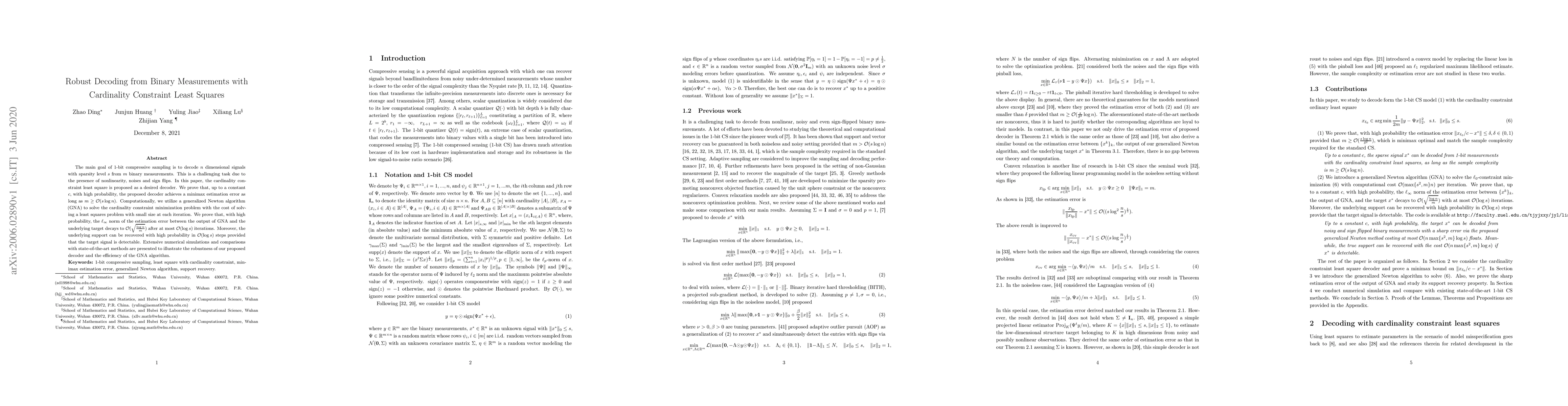 The main goal of 1-bit compressive sampling is to decode $n$ dimensional signals with sparsity level $s$ from $m$ binary measurements. This is a challenging task due to the presence of nonlinearity, noises and sign flips. In this paper, the cardinality constraint least square is proposed as a desired decoder. We prove that, up to a constant $c$, with high probability, the proposed decoder achieves a minimax estimation error as long as $m \geq \mathcal{O}( s\log n)$. Computationally, we utilize a generalized Newton algorithm (GNA) to solve the cardinality constraint minimization problem with the cost of solving a least squares problem with small size at each iteration. We prove that, with high probability, the $\ell_{\infty}$ norm of the estimation error between the output of GNA and the underlying target decays to $\mathcal{O}(\sqrt{\frac{\log n }{m}}) $ after at most $\mathcal{O}(\log s)$ iterations. Moreover, the underlying support can be recovered with high probability in $\mathcal{O}(\log s)$ steps provided that the target signal is detectable. Extensive numerical simulations and comparisons with state-of-the-art methods are presented to illustrate the robustness of our proposed decoder and the efficiency of the GNA algorithm.