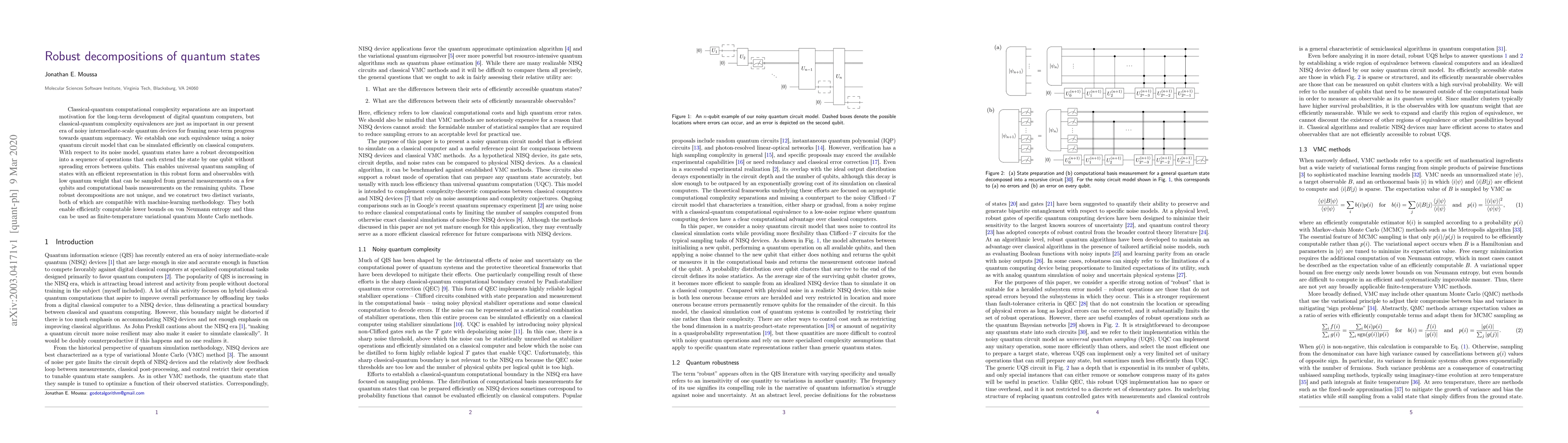 Classical-quantum computational complexity separations are an important motivation for the long-term development of digital quantum computers, but classical-quantum complexity equivalences are just as important in our present era of noisy intermediate-scale quantum devices for framing near-term progress towards quantum supremacy. We establish one such equivalence using a noisy quantum circuit model that can be simulated efficiently on classical computers. With respect to its noise model, quantum states have a robust decomposition into a sequence of operations that each extend the state by one qubit without spreading errors between qubits. This enables universal quantum sampling of states with an efficient representation in this robust form and observables with low quantum weight that can be sampled from general measurements on a few qubits and computational basis measurements on the remaining qubits. These robust decompositions are not unique, and we construct two distinct variants, both of which are compatible with machine-learning methodology. They both enable efficiently computable lower bounds on von Neumann entropy and thus can be used as finite-temperature variational quantum Monte Carlo methods.