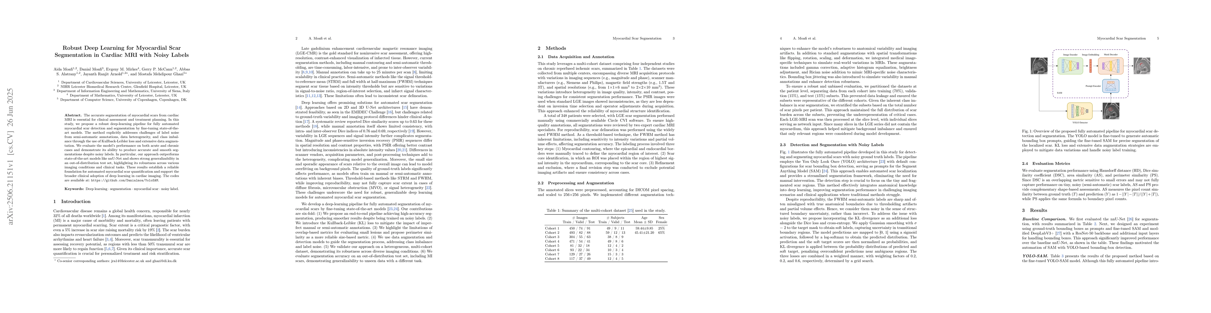 The paper introduces a robust deep-learning pipeline for myocardial scar segmentation using Kullback-Leibler loss and extensive data augmentation strategies to handle noisy labels, data heterogeneity, and class imbalance.
