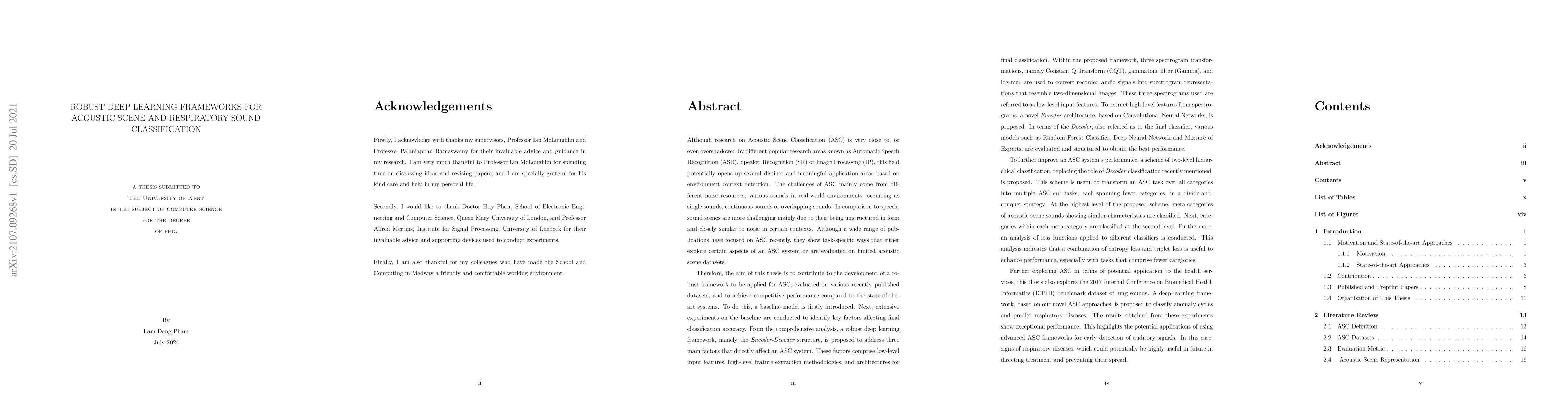 This research develops robust deep learning frameworks for acoustic scene classification (ASC) using multiple spectrogram inputs and novel Encoder-Decoder architectures, which are then applied to detect respiratory diseases from sound data, demonstrating effective anomaly cycle and disease detection.