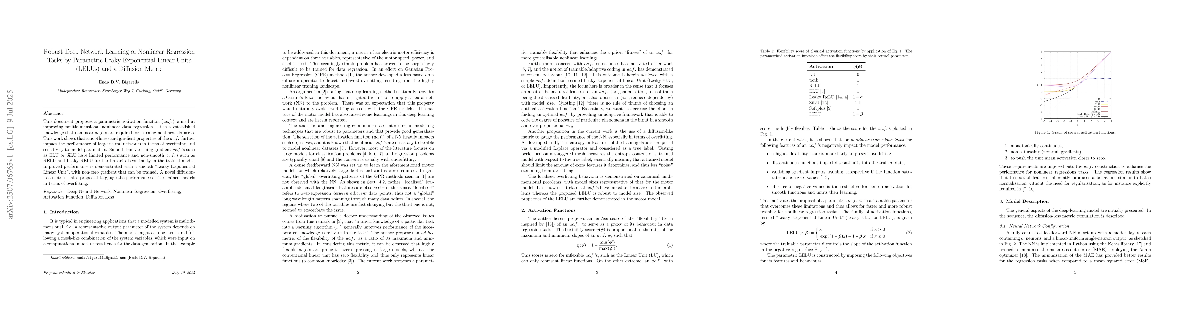 This document proposes a parametric activation function (ac.f.) aimed at improving multidimensional nonlinear data regression. It is a established knowledge that nonlinear ac.f.'s are required for learning nonlinear datasets. This work shows that smoothness and gradient properties of the ac.f. further impact the performance of large neural networks in terms of overfitting and sensitivity to model parameters. Smooth but vanishing-gradient ac.f.'s such as ELU or SiLU have limited performance and non-smooth ac.f.'s such as RELU and Leaky-RELU further impart discontinuity in the trained model. Improved performance is demonstrated with a smooth "Leaky Exponential Linear Unit", with non-zero gradient that can be trained. A novel diffusion-loss metric is also proposed to gauge the performance of the trained models in terms of overfitting.