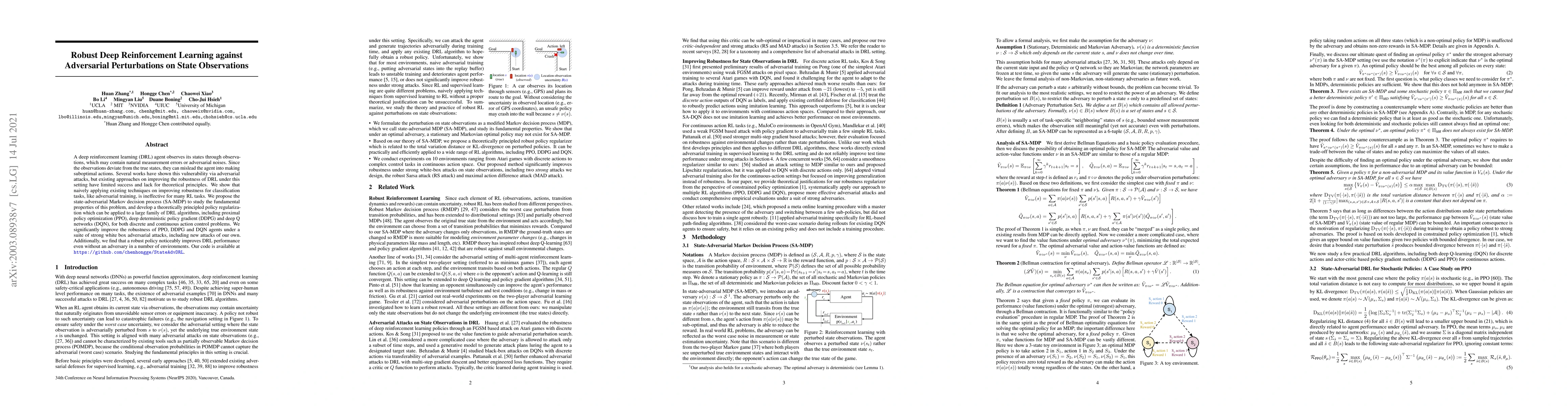 This paper addresses the vulnerability of deep reinforcement learning (DRL) agents to adversarial perturbations in state observations, proposing a theoretically principled policy regularization method. The study introduces the state-adversarial Markov decision process (SA-MDP) and demonstrates significant improvements in the robustness of DRL algorithms like PPO, DDPG, and DQN against strong white box attacks, while also enhancing performance in non-adversarial environments.