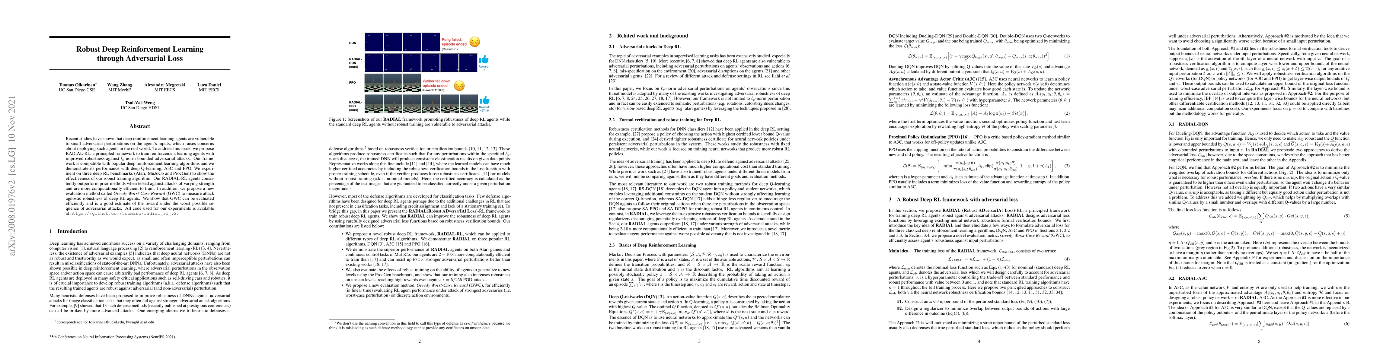 This paper introduces RADIAL-RL, a framework to enhance the robustness of deep reinforcement learning agents against adversarial attacks, demonstrating superior performance across various algorithms and benchmarks. It also proposes the Greedy Worst-Case Reward (GWC) method for evaluating attack agnostic robustness.