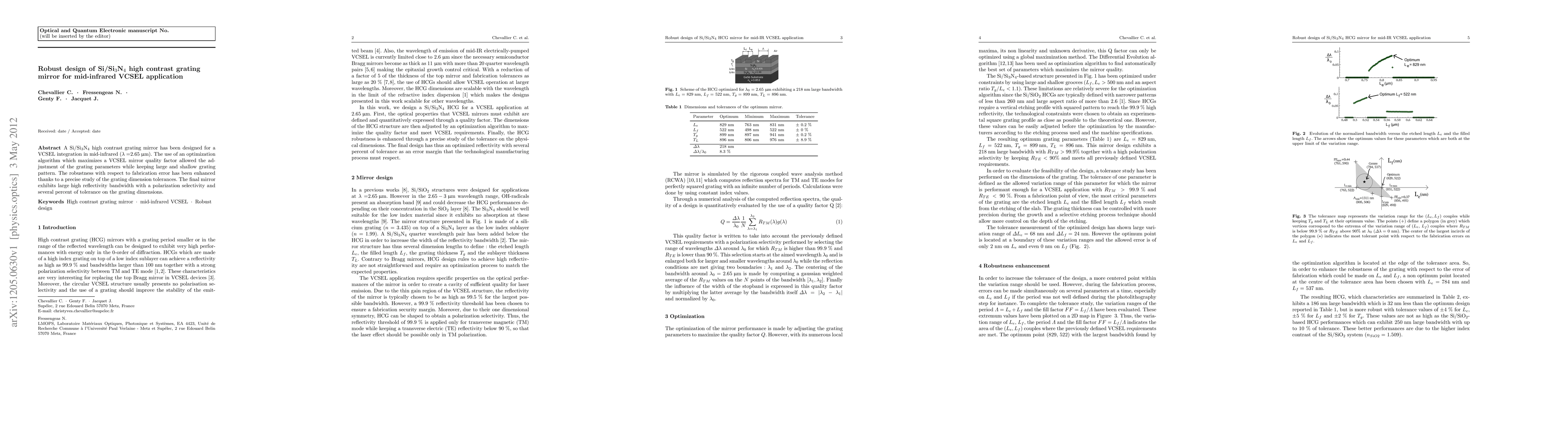 A Si/Si3N4 high contrast grating mirror has been designed for a VCSEL integration in mid-infrared ({\lambda} = 2.65 $\mu$m). The use of an optimization algorithm which maximizes a VCSEL mirror quality factor allowed the adjustment of the grating parameters while keeping large and shallow grating pattern. The robustness with respect to fabrication error has been enhanced thanks to a precise study of the grating dimension tolerances. The final mirror exhibits large high reflectivity bandwidth with a polarization selectivity and several percent of tolerance on the grating dimensions.