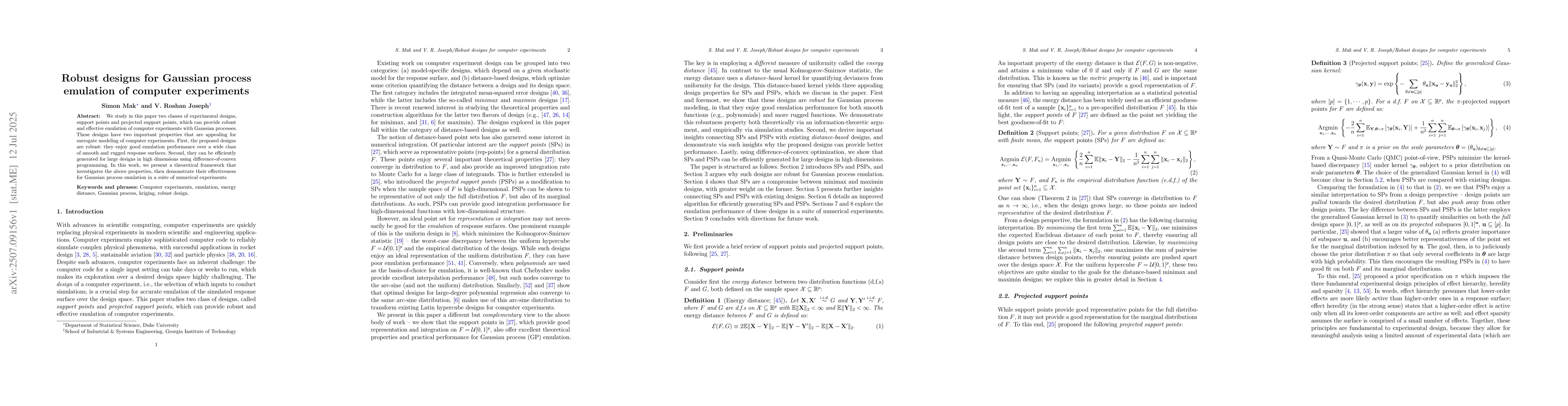 We study in this paper two classes of experimental designs, support points and projected support points, which can provide robust and effective emulation of computer experiments with Gaussian processes. These designs have two important properties that are appealing for surrogate modeling of computer experiments. First, the proposed designs are robust: they enjoy good emulation performance over a wide class of smooth and rugged response surfaces. Second, they can be efficiently generated for large designs in high dimensions using difference-of-convex programming. In this work, we present a theoretical framework that investigates the above properties, then demonstrate their effectiveness for Gaussian process emulation in a suite of numerical experiments.