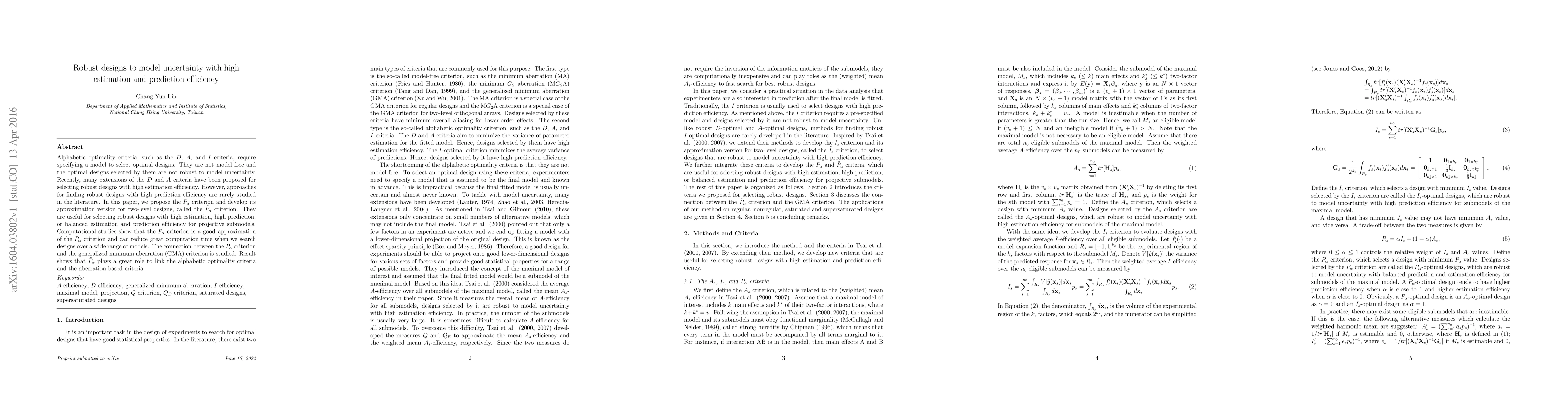This paper introduces the $P_\alpha$ criterion for robust design selection, focusing on high prediction efficiency, and proposes an approximation ${\tilde P_\alpha}$ for two-level designs. It demonstrates computational efficiency and links the new criteria to generalized minimum aberration, bridging alphabetic and aberration-based optimality approaches.