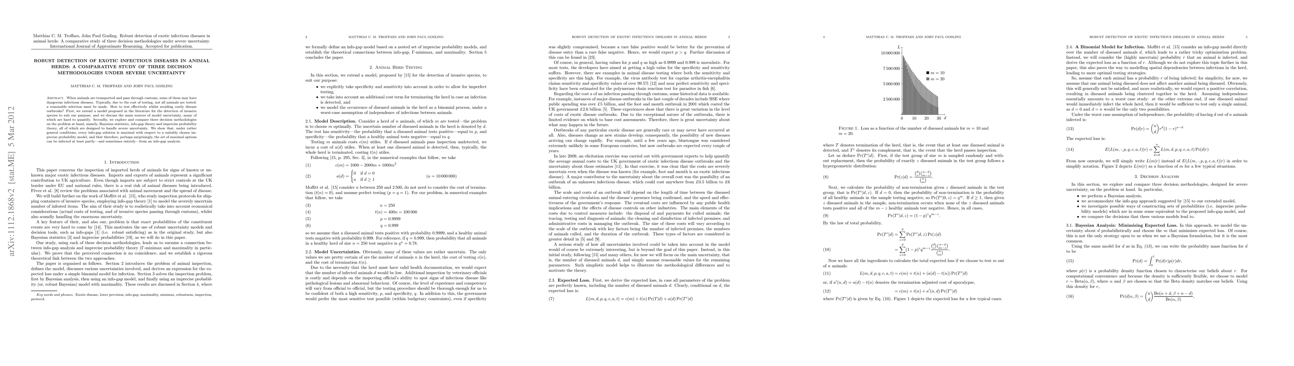 This paper compares three decision methodologies—Bayesian statistics, info-gap theory, and imprecise probability theory—to detect exotic infectious diseases in animal herds under severe uncertainty. It demonstrates that info-gap solutions can infer maximal options, sometimes entirely, aiding effective and cost-efficient disease detection.