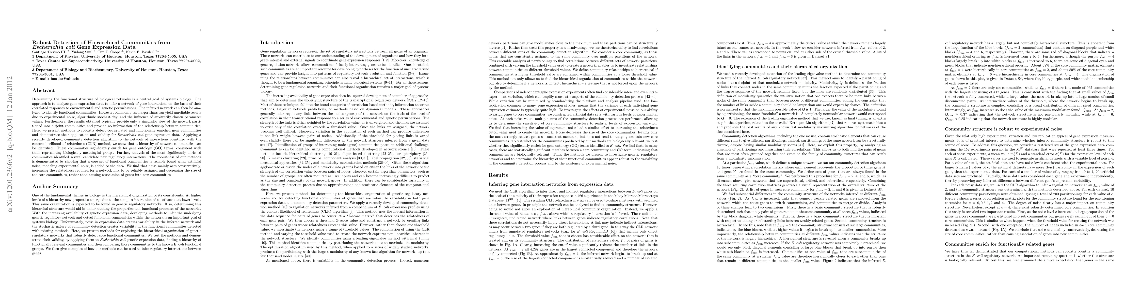 This paper presents robust methods to detect hierarchical communities in Escherichia coli gene expression data, addressing issues with existing algorithms like noise and parameter choice. The proposed approach identifies coregulated and functionally enriched gene communities, revealing a hierarchy and significantly enriching gene ontology terms, and demonstrates its robustness by maintaining core communities under added noise.