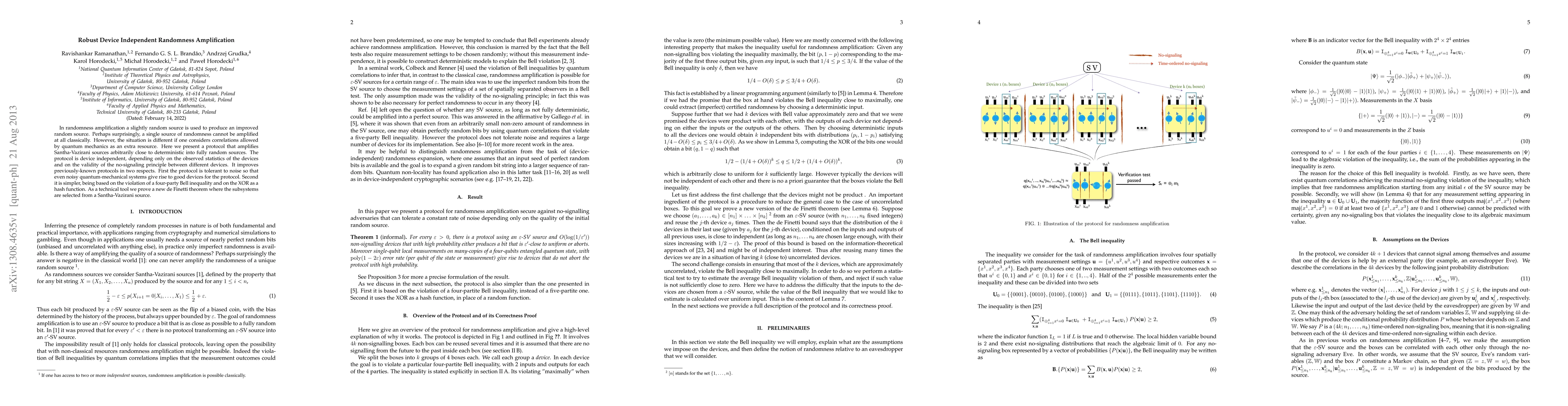 This paper presents a device-independent protocol for amplifying randomness from Santha-Vazirani sources using quantum correlations, which is robust against noise and simpler than previous methods, relying on a four-party Bell inequality and XOR hashing. The protocol also proves a new de Finetti theorem for subsystems from Santha-Vazirani sources.