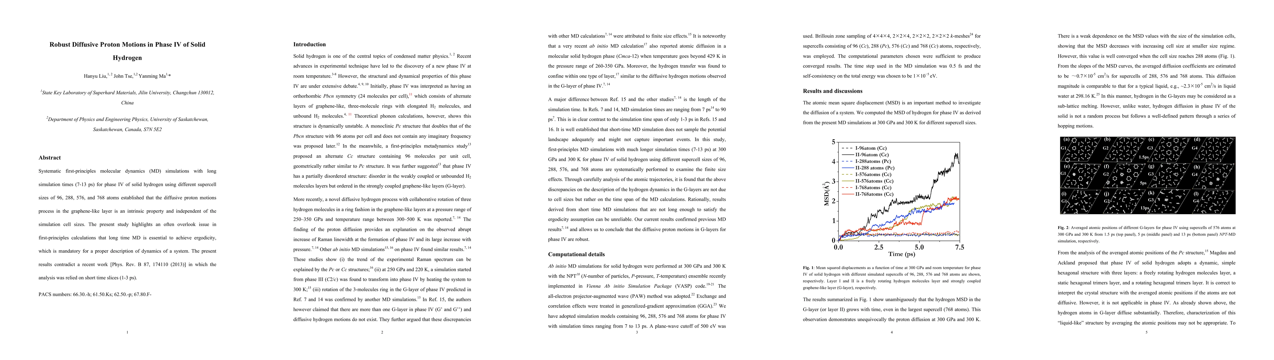 Systematic first-principles molecular dynamics (MD) simulations with long simulation times (7-13 ps) for phase IV of solid hydrogen using different supercell sizes of 96, 288, 576, and 768 atoms established that the diffusive proton motions process in the graphene-like layer is an intrinsic property and independent of the simulation cell sizes. The present study highlights an often overlook issue in first-principles calculations that long time MD is essential to achieve ergodicity, which is mandatory for a proper description of dynamics of a system. The present results contradict a recent work [Phys. Rev. B 87, 174110 (2013)] in which the analysis was relied on short time slices (1-3 ps).