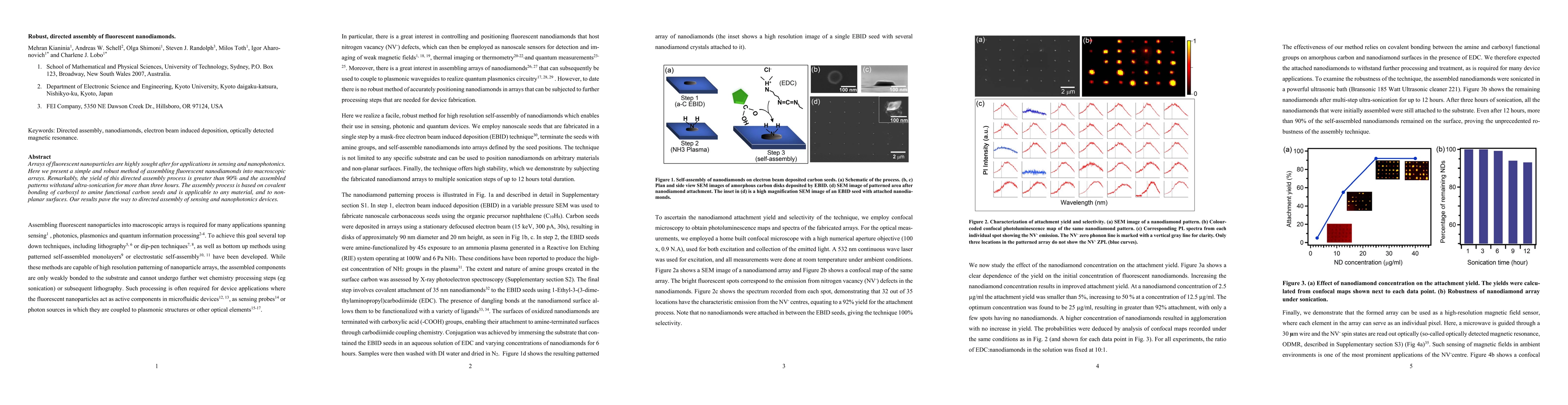 This paper describes a highly efficient method for assembling fluorescent nanodiamonds into durable macroscopic arrays using covalent bonding, achieving over 90% yield and stability under ultra-sonication. The technique is versatile and applicable to various materials and surfaces, promising advancements in sensing and nanophotonics.