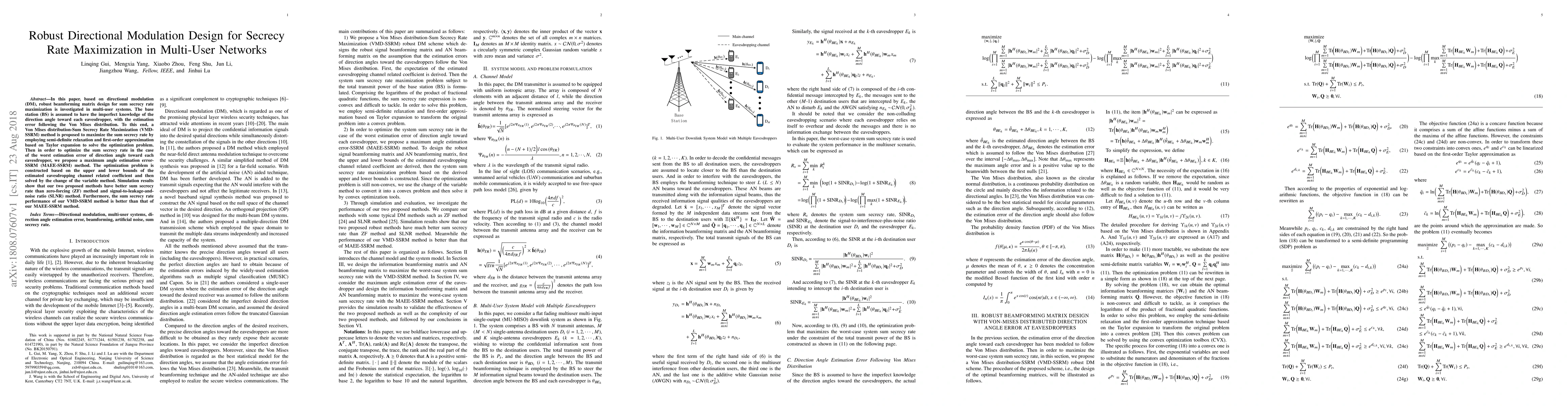 This paper proposes methods to maximize secrecy rate in multi-user networks using directional modulation, outperforming existing methods in terms of sum secrecy rate.