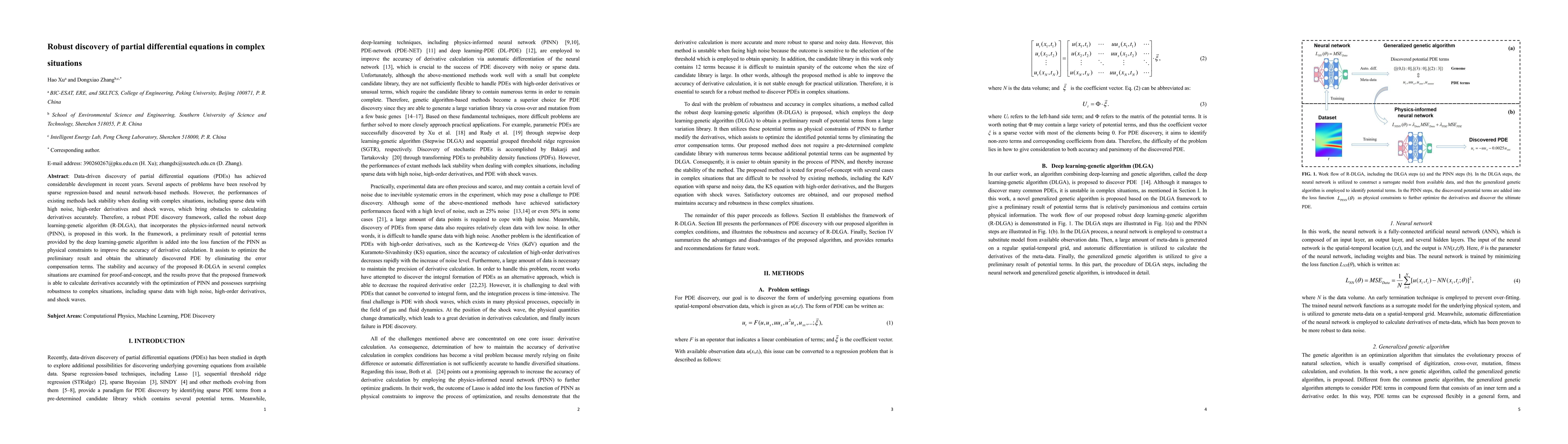 This paper proposes a robust deep learning-genetic algorithm (R-DLGA) framework that combines physics-informed neural networks with deep learning-genetic algorithms to accurately discover partial differential equations in complex situations, demonstrating improved stability and accuracy in scenarios with high noise, high-order derivatives, and shock waves.