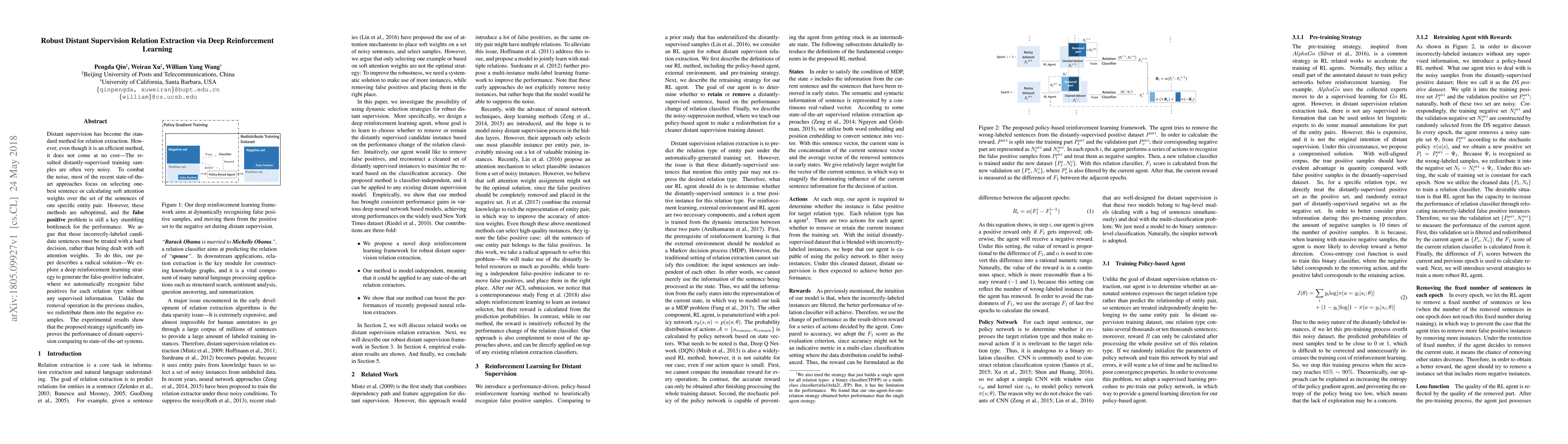 This paper proposes a robust distant supervision method for relation extraction using deep reinforcement learning to identify and redistribute false positives, thereby improving the accuracy of relation extraction compared to existing approaches. The reinforcement learning strategy automatically recognizes incorrect labels without supervised information, enhancing the overall performance of distant supervision.