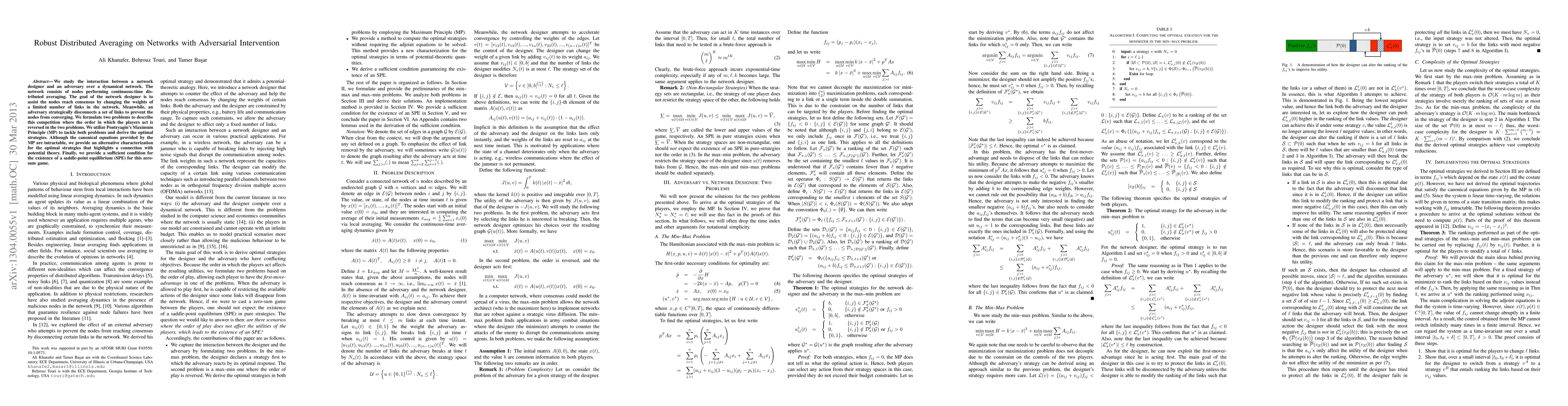 We study the interaction between a network designer and an adversary over a dynamical network. The network consists of nodes performing continuous-time distributed averaging. The goal of the network designer is to assist the nodes reach consensus by changing the weights of a limited number of links in the network. Meanwhile, an adversary strategically disconnects a set of links to prevent the nodes from converging. We formulate two problems to describe this competition where the order in which the players act is reversed in the two problems. We utilize Pontryagin's Maximum Principle (MP) to tackle both problems and derive the optimal strategies. Although the canonical equations provided by the MP are intractable, we provide an alternative characterization for the optimal strategies that highlights a connection with potential theory. Finally, we provide a sufficient condition for the existence of a saddle-point equilibrium (SPE) for this zero-sum game.