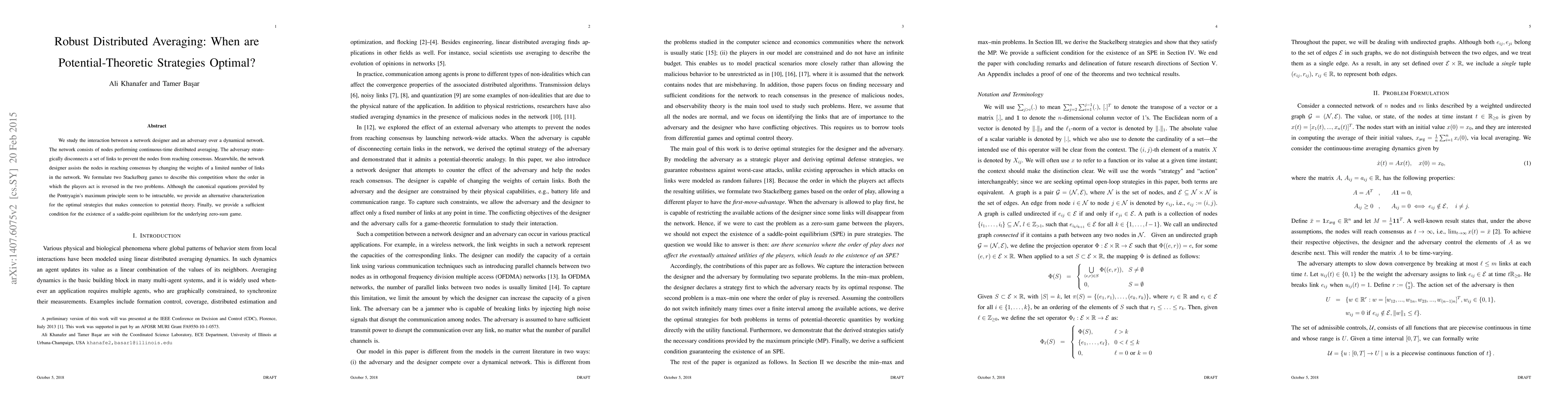 We study the interaction between a network designer and an adversary over a dynamical network. The network consists of nodes performing continuous-time distributed averaging. The adversary strategically disconnects a set of links to prevent the nodes from reaching consensus. Meanwhile, the network designer assists the nodes in reaching consensus by changing the weights of a limited number of links in the network. We formulate two Stackelberg games to describe this competition where the order in which the players act is reversed in the two problems. Although the canonical equations provided by the Pontryagin's maximum principle seem to be intractable, we provide an alternative characterization for the optimal strategies that makes connection to potential theory. Finally, we provide a sufficient condition for the existence of a saddle-point equilibrium for the underlying zero-sum game.