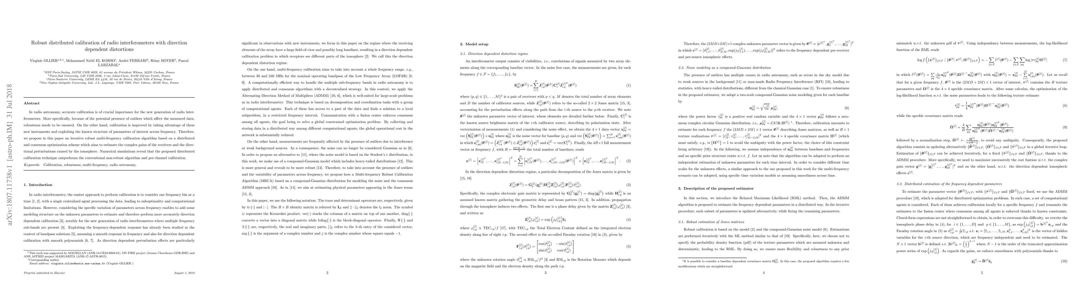 This paper proposes a robust, distributed calibration algorithm for radio interferometers to handle direction-dependent distortions and outliers. The iterative method leverages multi-frequency data and consensus optimization to estimate receiver gains and ionospheric perturbations, outperforming conventional non-robust techniques in simulations.