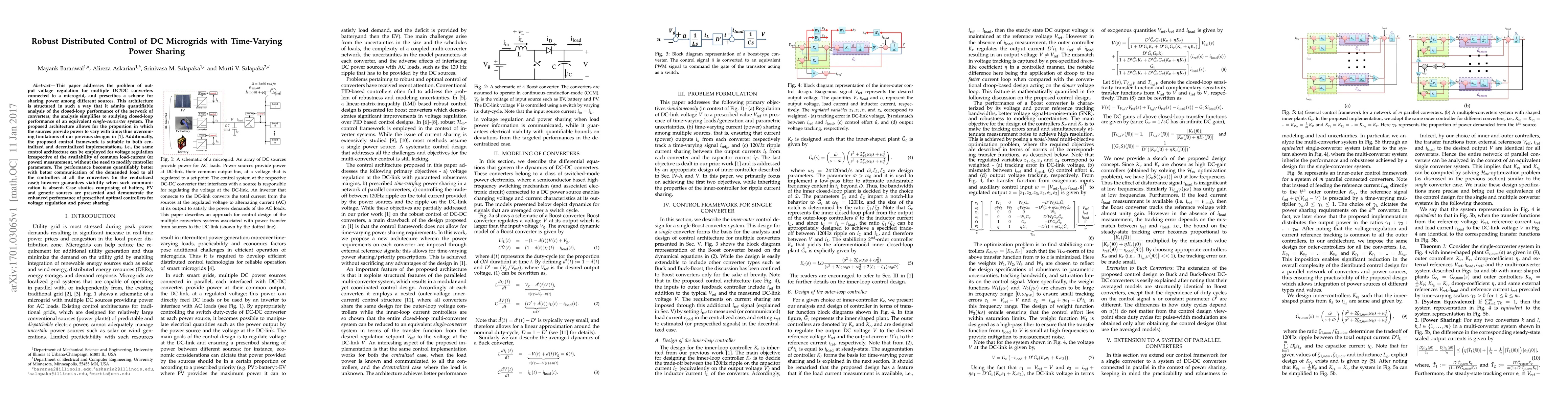 This paper addresses the problem of output voltage regulation for multiple DC/DC converters connected to a microgrid, and prescribes a scheme for sharing power among different sources. This architecture is structured in such a way that it admits quantifiable analysis of the closed-loop performance of the network of converters; the analysis simplifies to studying closed-loop performance of an equivalent {\em single-converter} system. The proposed architecture allows for the proportion in which the sources provide power to vary with time; thus overcoming limitations of our previous designs. Additionally, the proposed control framework is suitable to both centralized and decentralized implementations, i.e., the same control architecture can be employed for voltage regulation irrespective of the availability of common load-current (or power) measurement, without the need to modify controller parameters. The performance becomes quantifiably better with better communication of the demanded load to all the controllers at all the converters (in the centralized case); however guarantees viability when such communication is absent. Case studies comprising of battery, PV and generic sources are presented and demonstrate the enhanced performance of prescribed optimal controllers for voltage regulation and power sharing.