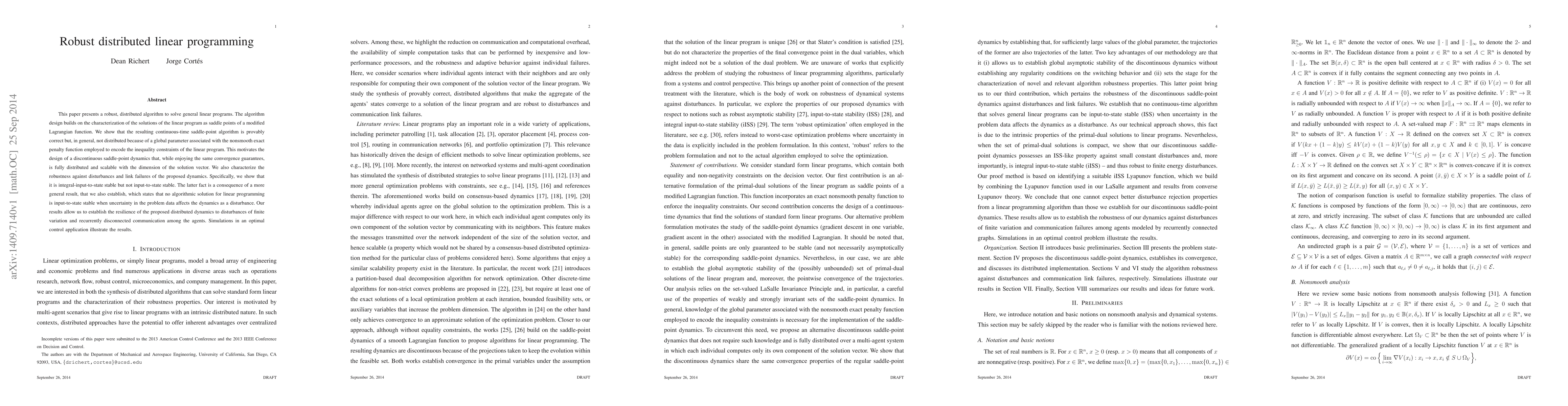 This paper introduces a robust, distributed algorithm for solving general linear programs, leveraging saddle-point dynamics of a modified Lagrangian function. The proposed discontinuous dynamics ensures full distribution and scalability while maintaining convergence guarantees, though it is shown to be integral-input-to-state stable due to inherent instability under input-to-state conditions when faced with data disturbances.