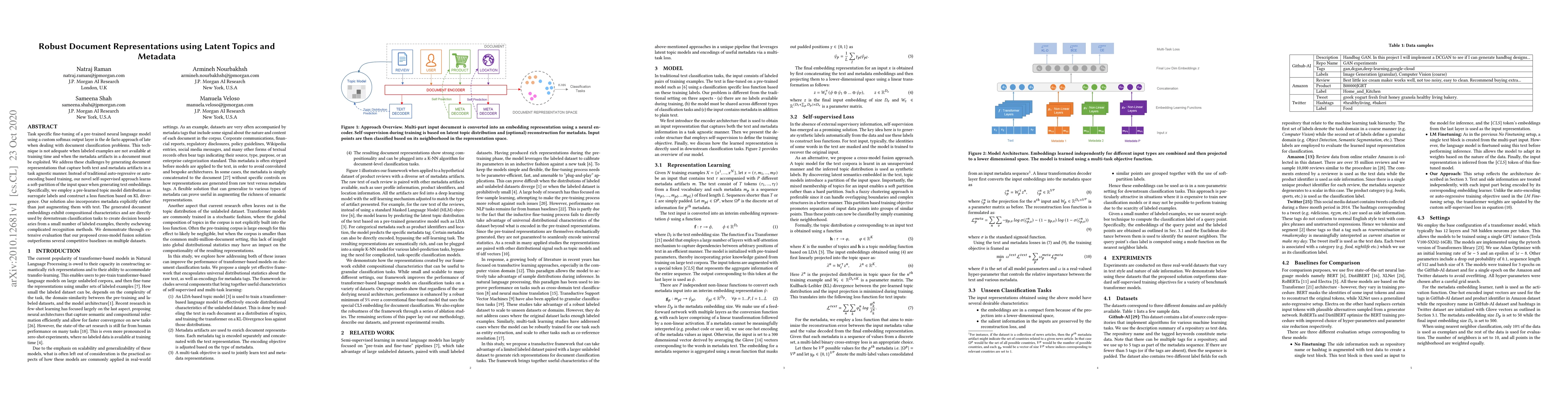 This paper proposes a self-supervised method for generating robust document representations that integrate both text and metadata, using a pre-learned topic model and KL divergence loss. The approach outperforms traditional fine-tuning methods in document classification tasks, especially when labeled data is scarce.