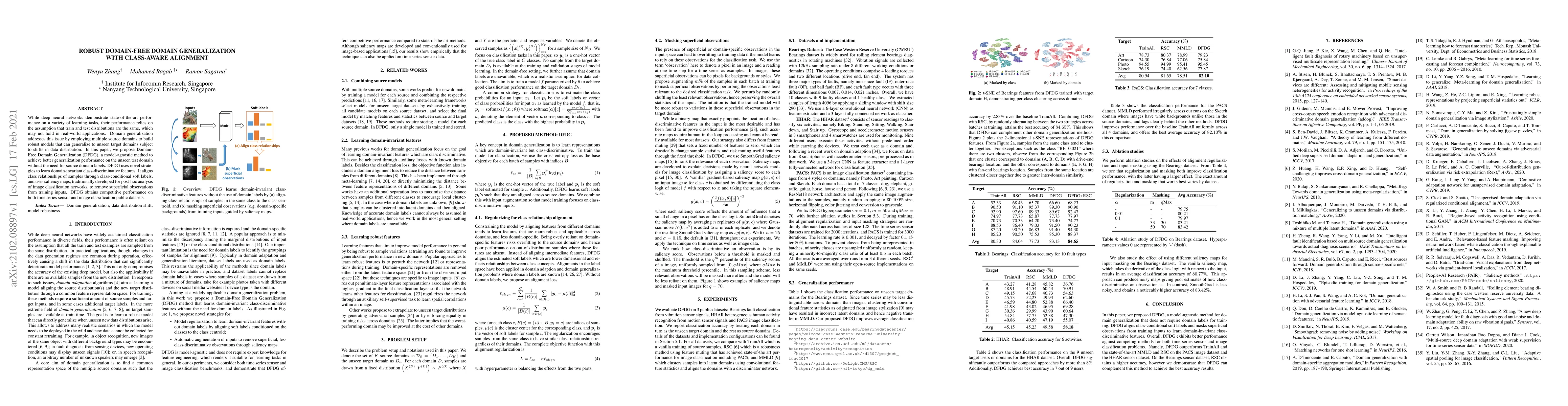 This paper proposes Domain-Free Domain Generalization (DFDG), a model-agnostic method that achieves better generalization performance on unseen test domains without source domain labels. DFDG uses class-conditional soft labels and saliency maps to learn domain-invariant features, outperforming existing methods on time series sensor and image classification datasets.