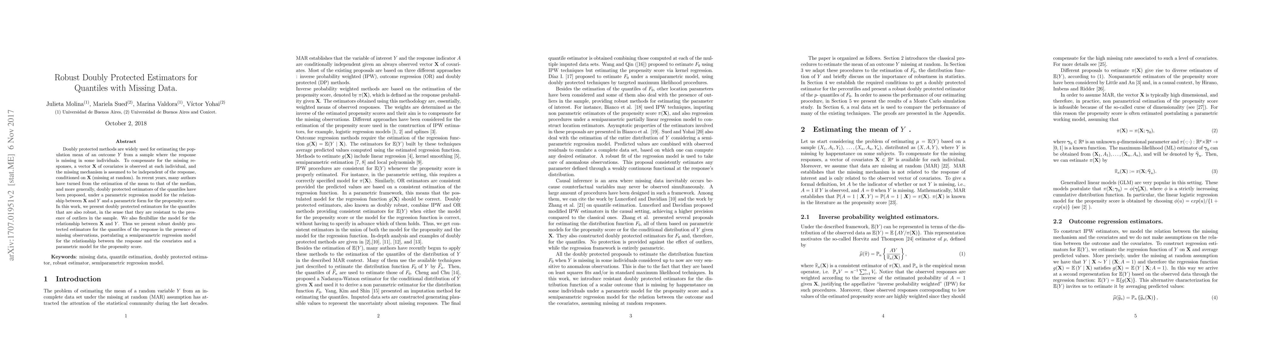 Doubly protected estimators are widely used for estimating the population mean of an outcome Y from a sample where the response is missing in some individuals. To compensate for the missing responses, a vector X of covariates is observed at each individual, and the missing mechanism is assumed to be independent of the response, conditioned on X (missing at random). In recent years, many authors have moved from the mean to the median, and more generally, doubly protected estimators of the quantiles have been proposed, assuming a parametric regression model for the relationship between X and Y and a parametric form for the propensity score. In this work, we present doubly protected estimators for the quantiles that are also robust, in the sense that they are resistant to the presence of outliers in the sample. We also flexibilize the model for the relationship between X and Y . Thus we present robust doubly protected estimators for the quantiles of the response in the presence of missing observations, postulating a semiparametric regression model for the relationship between the response and the covariates and a parametric model for the propensity score.