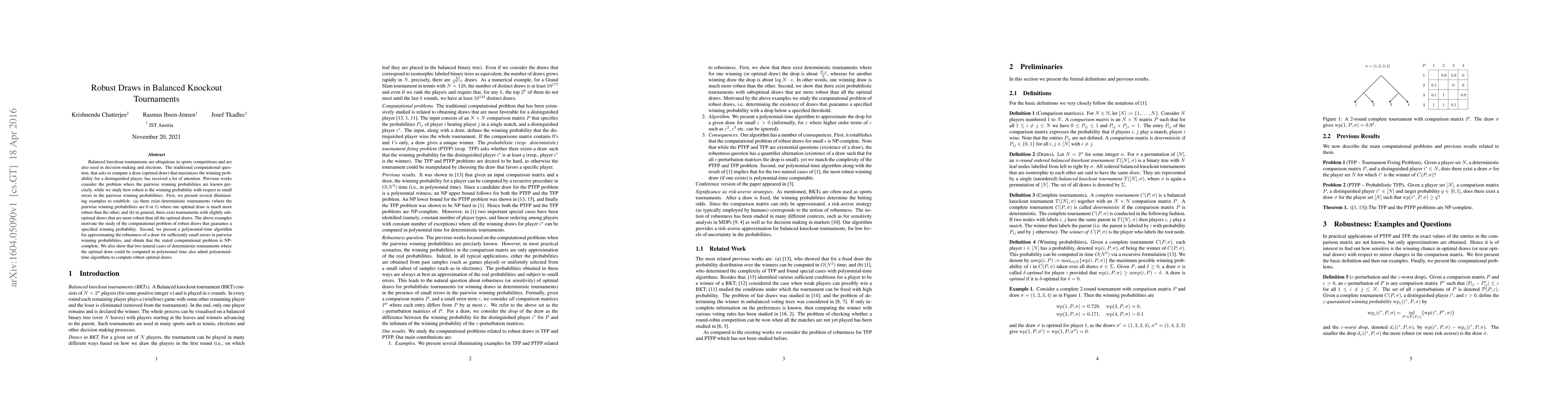 The paper investigates robust draws in knockout tournaments with small errors in pairwise winning probabilities, showing that certain draws can be more resilient to such errors than others.
