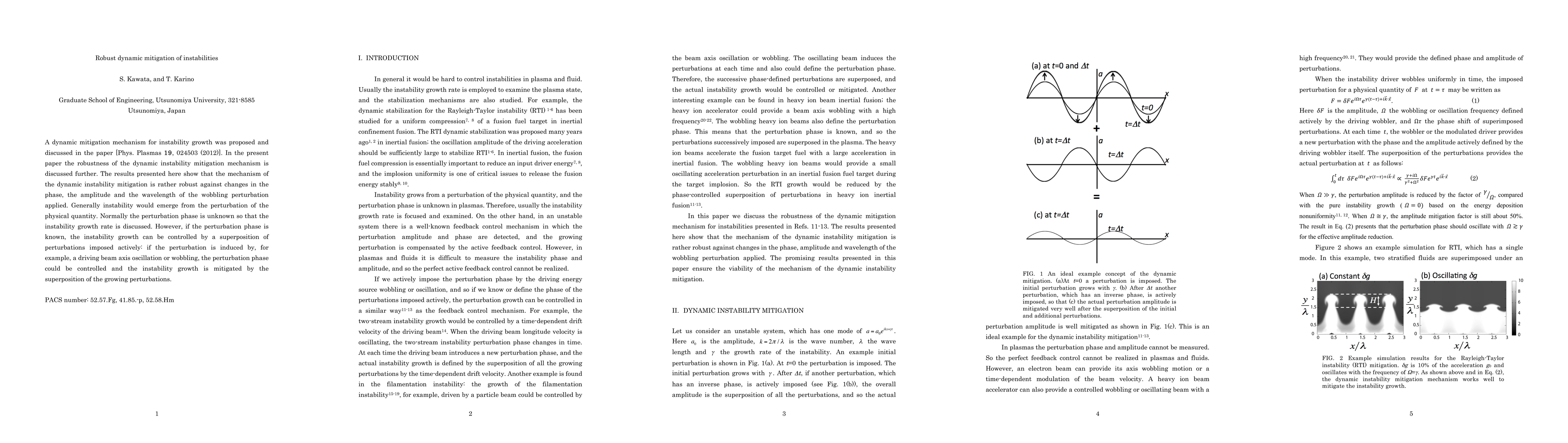 A dynamic mitigation mechanism for instability growth was proposed and discussed in the paper [Phys. Plasmas 19, 024503 (2012)]. In the present paper the robustness of the dynamic instability mitigation mechanism is discussed further. The results presented here show that the mechanism of the dynamic instability mitigation is rather robust against changes in the phase, the amplitude and the wavelength of the wobbling perturbation applied. Generally instability would emerge from the perturbation of the physical quantity. Normally the perturbation phase is unknown so that the instability growth rate is discussed. However, if the perturbation phase is known, the instability growth can be controlled by a superposition of perturbations imposed actively: if the perturbation is induced by, for example, a driving beam axis oscillation or wobbling, the perturbation phase could be controlled and the instability growth is mitigated by the superposition of the growing perturbations.
