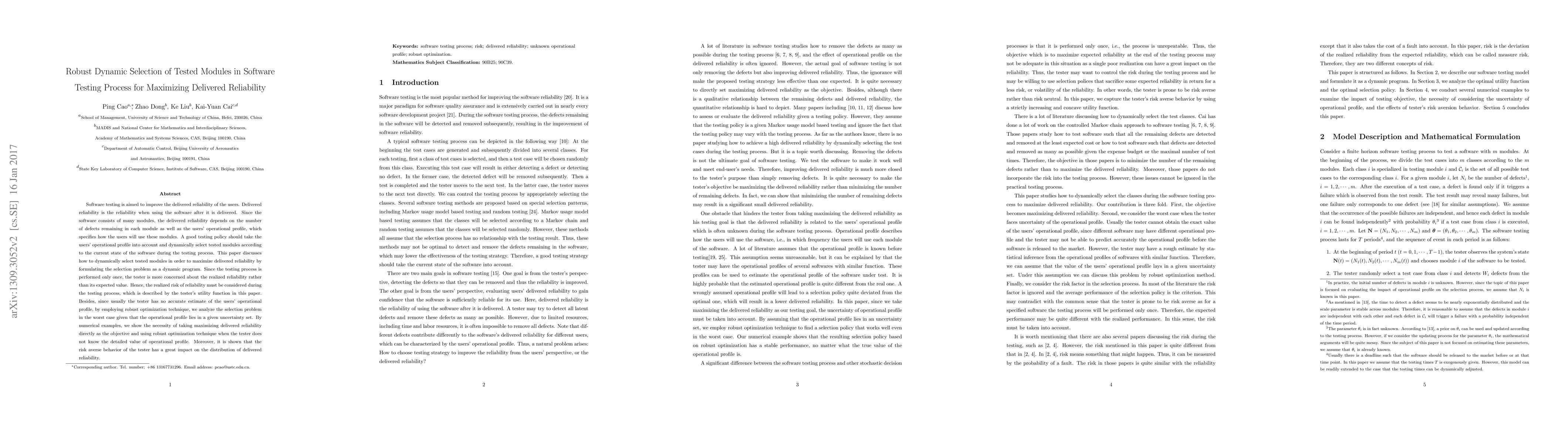 Software testing is aimed to improve the delivered reliability of the users. Delivered reliability is the reliability of using the software after it is delivered to the users. Usually the software consists of many modules. Thus, the delivered reliability is dependent on the operational profile which specifies how the users will use these modules as well as the defect number remaining in each module. Therefore, a good testing policy should take the operational profile into account and dynamically select tested modules according to the current state of the software during the testing process. This paper discusses how to dynamically select tested modules in order to maximize delivered reliability by formulating the selection problem as a dynamic programming problem. As the testing process is performed only once, risk must be considered during the testing process, which is described by the tester's utility function in this paper. Besides, since usually the tester has no accurate estimate of the operational profile, by employing robust optimization technique, we analysis the selection problem in the worst case, given the uncertainty set of operational profile. By numerical examples, we show the necessity of maximizing delivered reliability directly and using robust optimization technique when the tester has no clear idea of the operational profile. Moreover, it is shown that the risk averse behavior of the tester has a major influence on the delivered reliability.