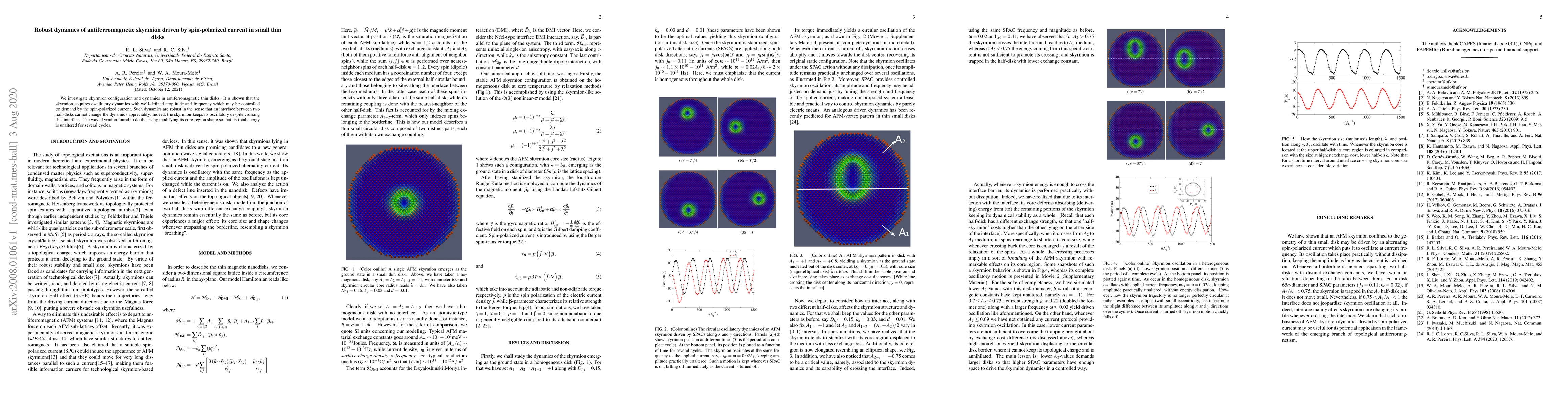 This study explores the dynamics of antiferromagnetic skyrmions in thin disks under spin-polarized current, revealing oscillatory skyrmion behavior with controllable amplitude and frequency. The skyrmion's robust dynamics persist even when crossing an interface between two half-disks, adapting its core shape to maintain energy balance.